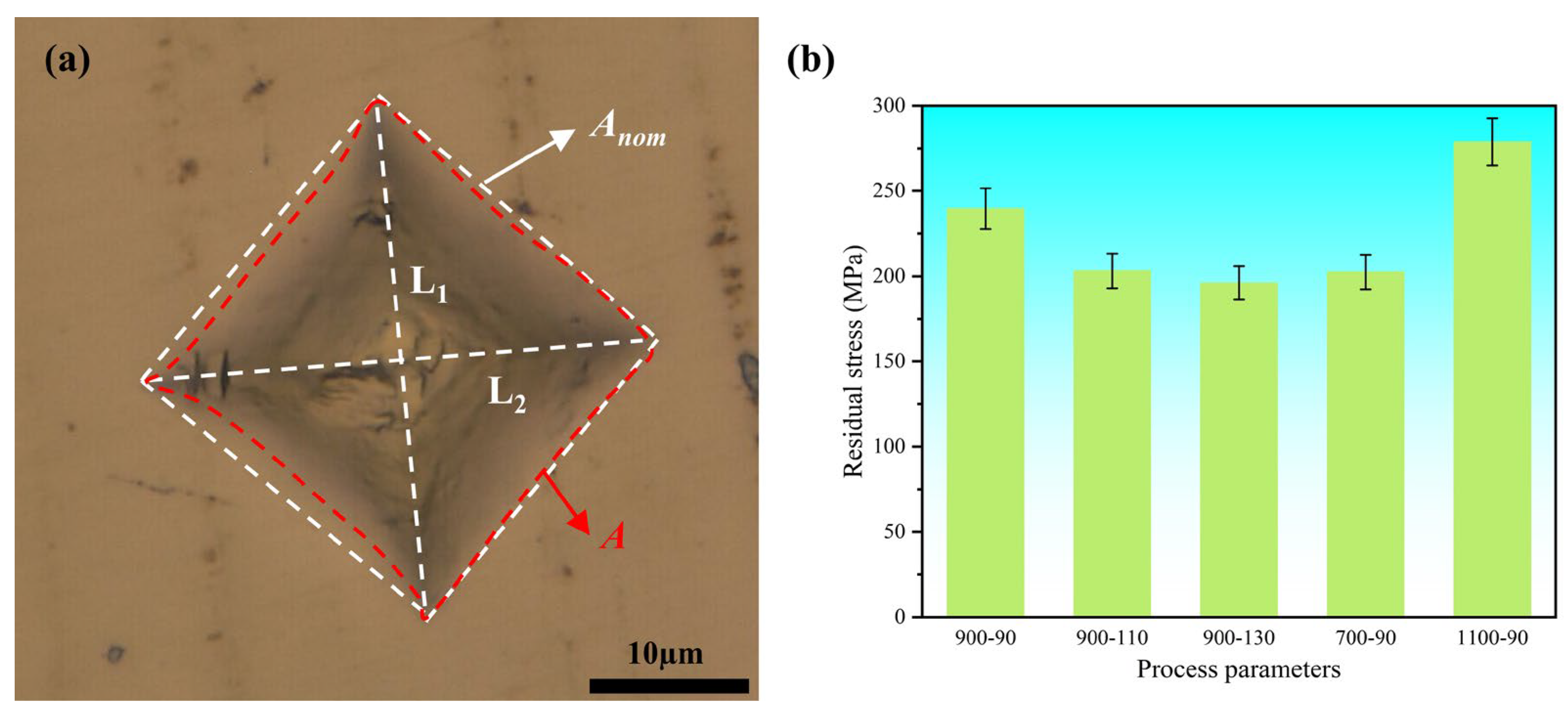 Figure 12. Single-track cross-sectional morphology and residual stress under different process parameters: (a) schematic of the indentation region; (b) residual stress of single tracks under varying process parameters.