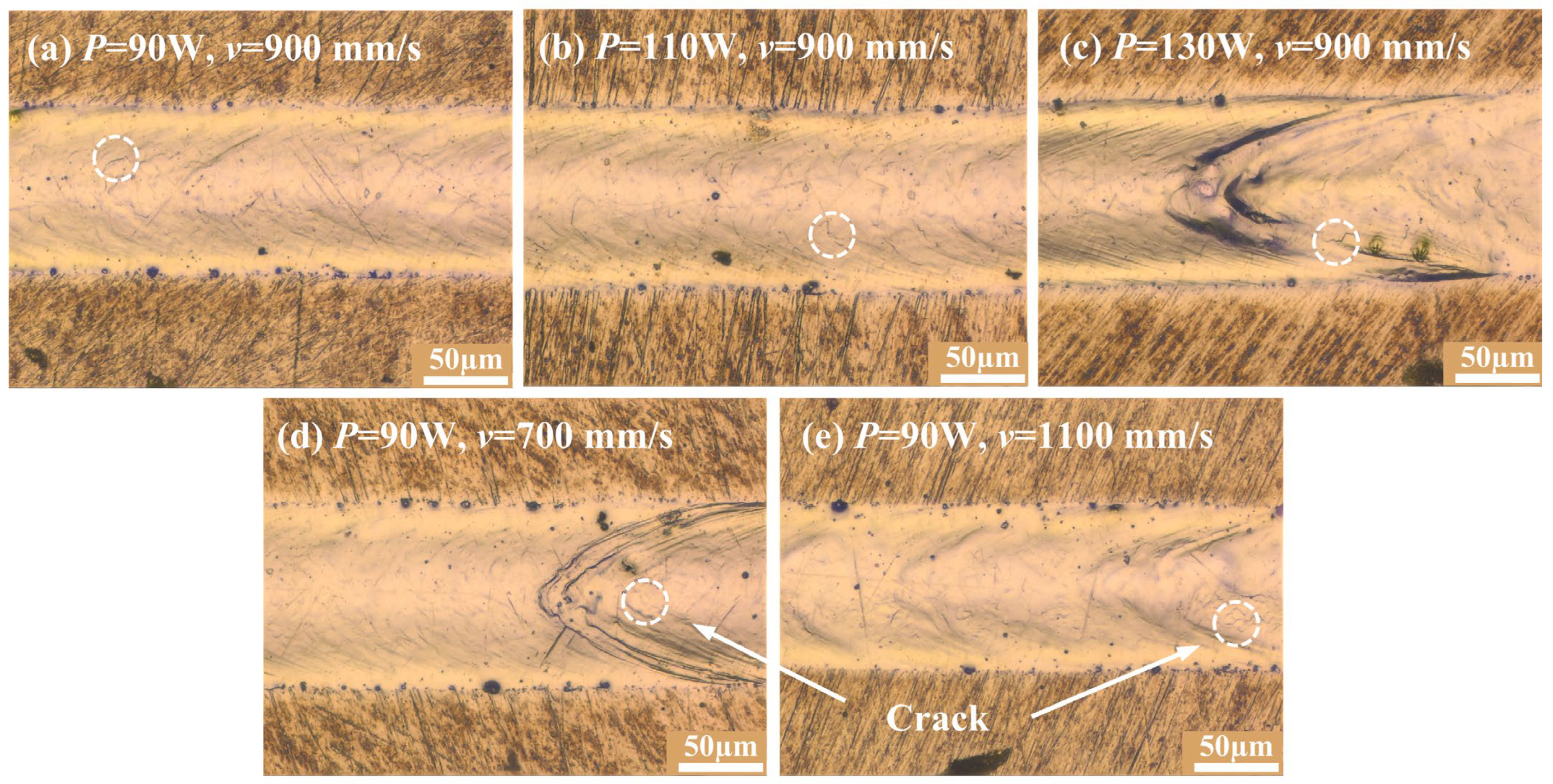 Figure 13. Surface morphology of single tracks under different process parameters: (a) P = 90 W, v = 900 mm/s; (b) P = 110 W, v = 900 mm/s; (c) P = 130 W, v = 900 mm/s; (d) P = 90 W, v = 700 mm/s; (e) P = 90 W, v = 1100 mm/s. Dashed circles indicate surface cracks.