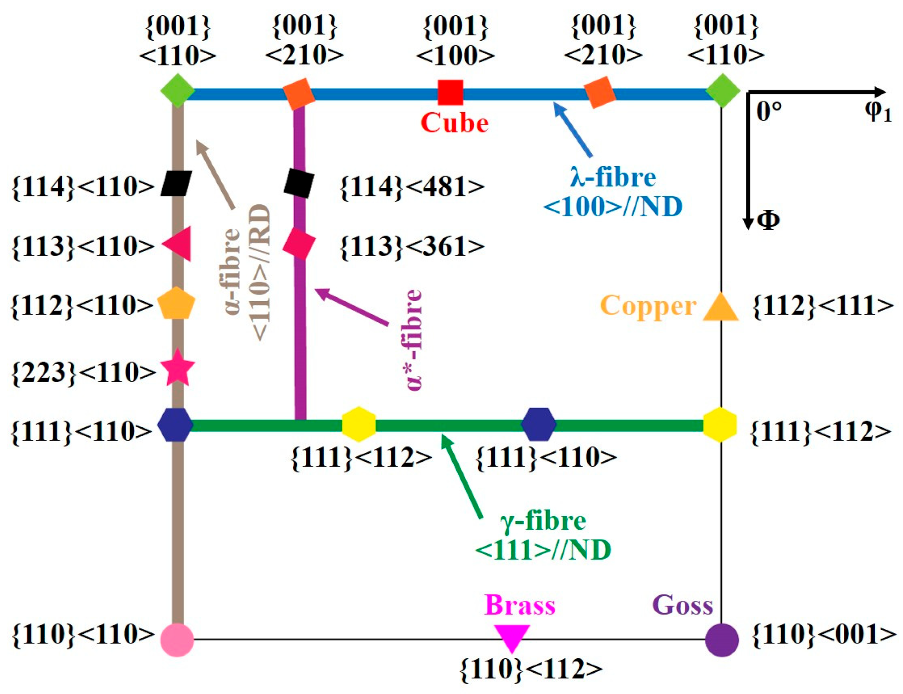 - Raabe, D.; Lücke, K. Rolling and annealing textures of BCC metals. Mater. Sci. Forum. 1994, 157, 597–610. [Google Scholar]
