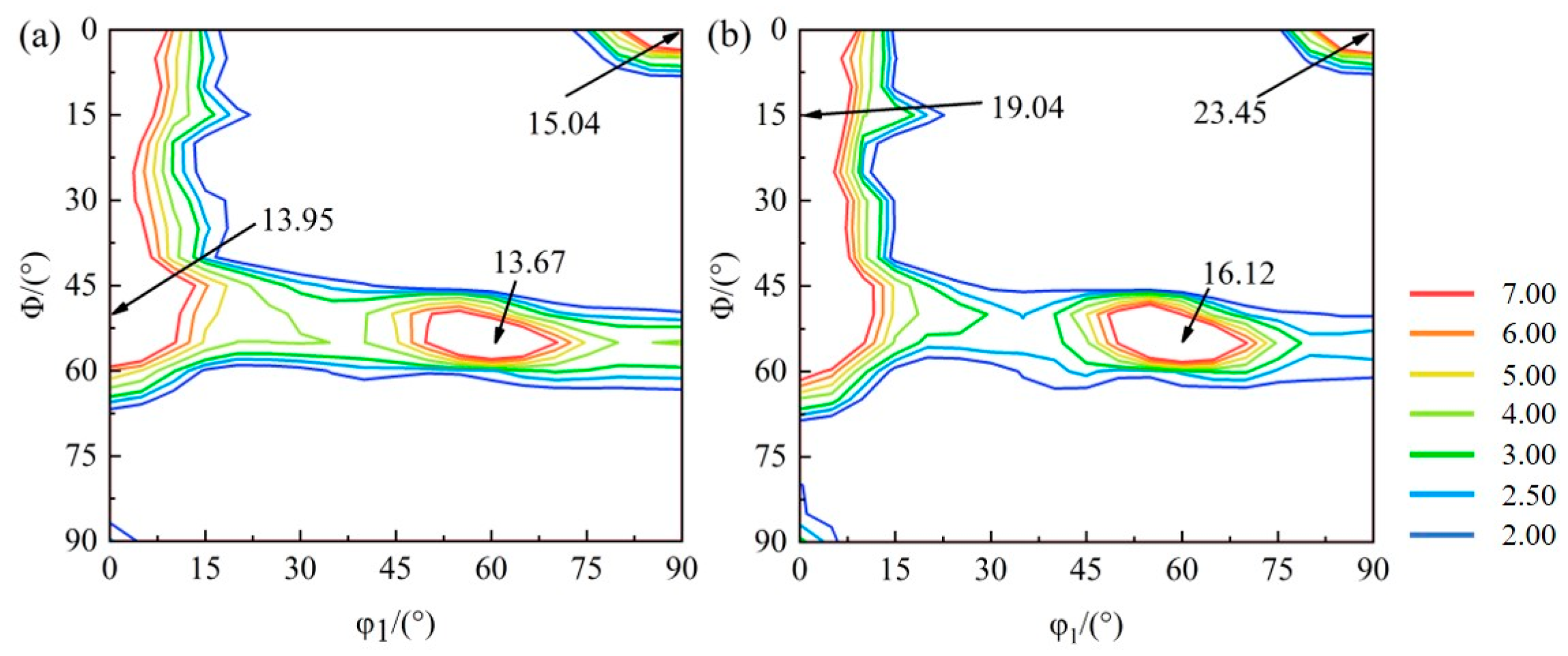 3.1. Microstructure and Texture of Cold-Rolled Sheet