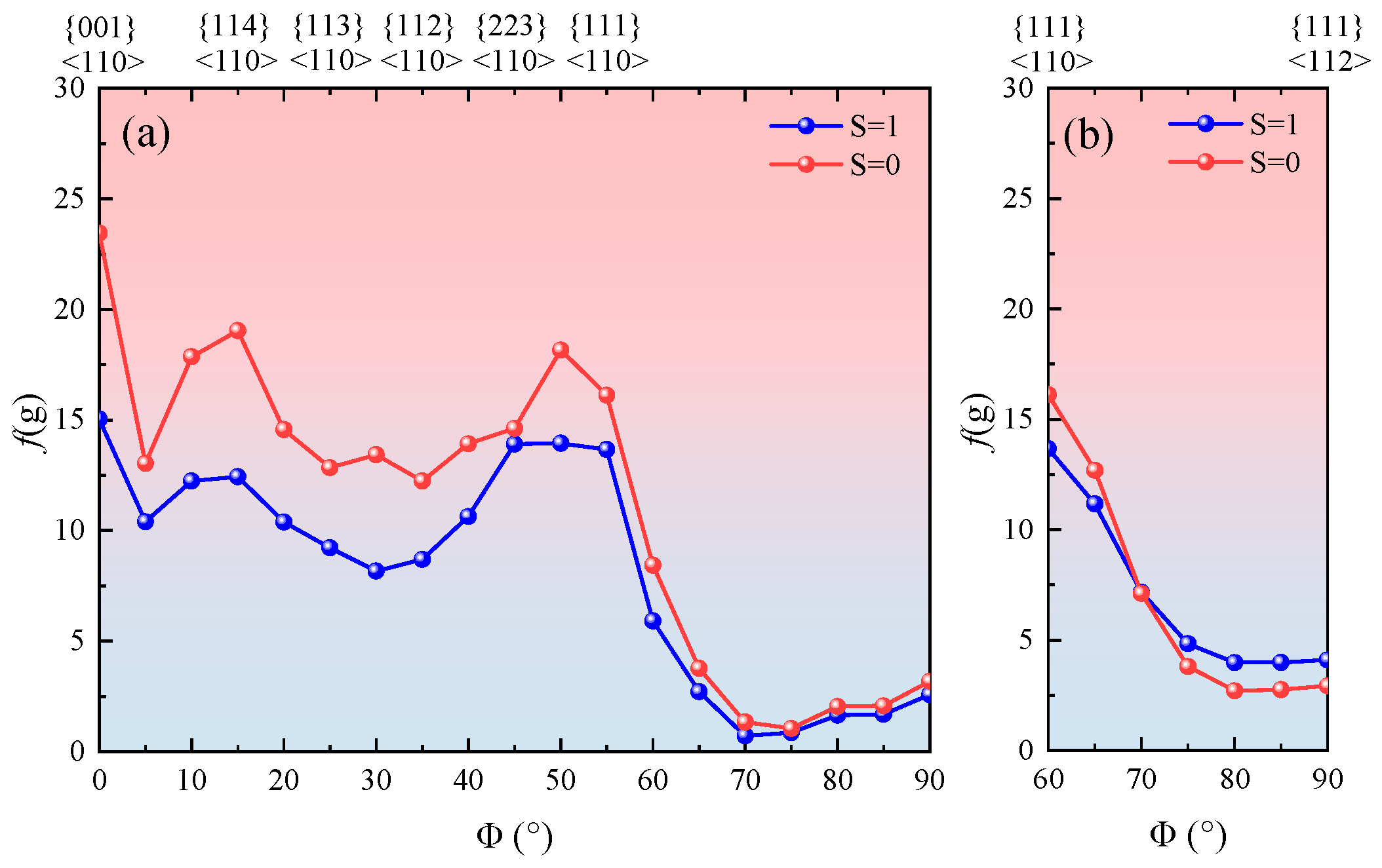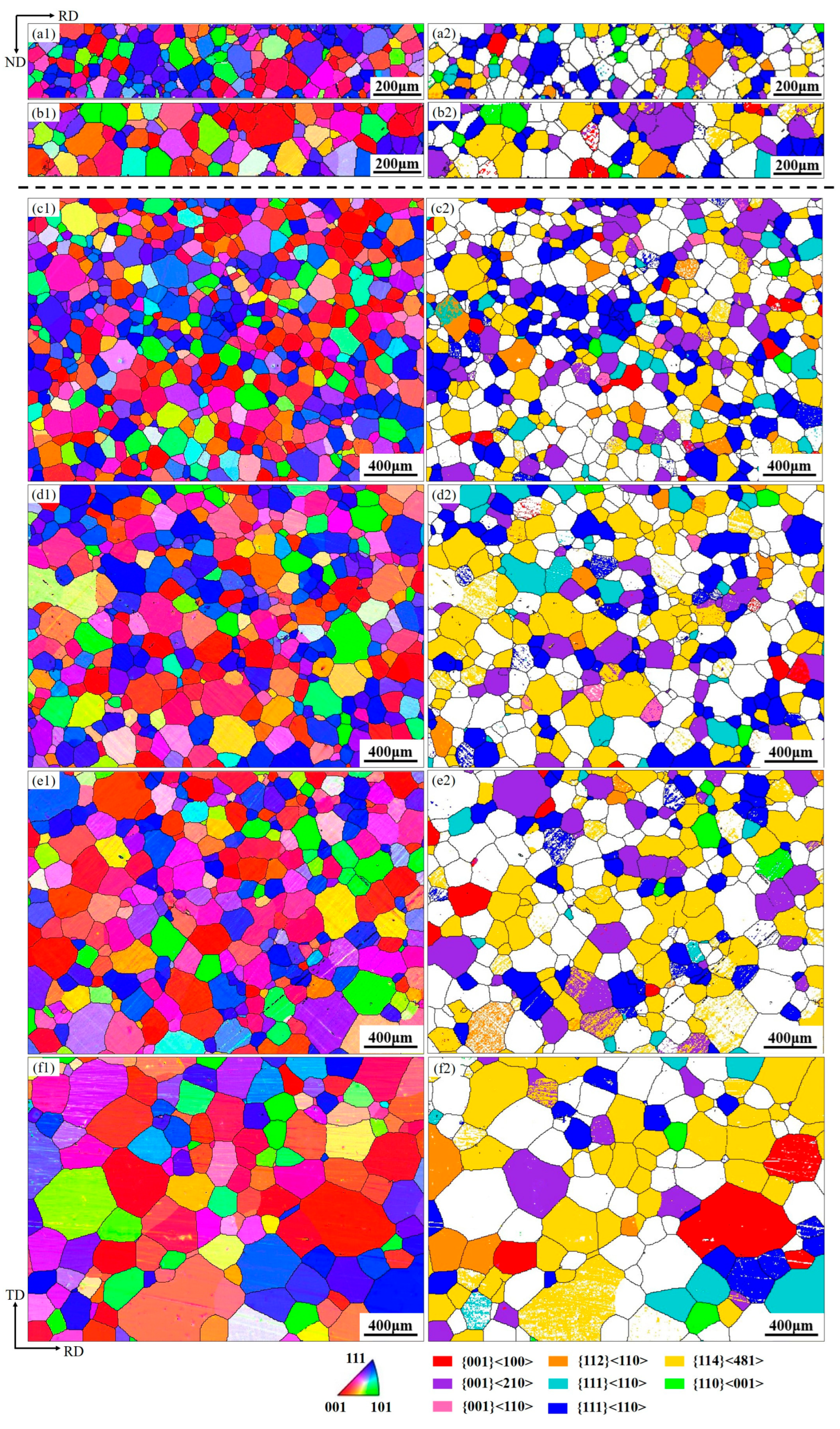 - Ning, X.; Liang, Y.; Wang, Y.; Feng, Y.; Lin, J. A comprehensive study on texture evolution and recrystallization mechanism of Fe-4.5 wt% Si with strong {114}<481>. J. Mater. Res. Technol. 2023, 27, 7506–7520. [Google Scholar]