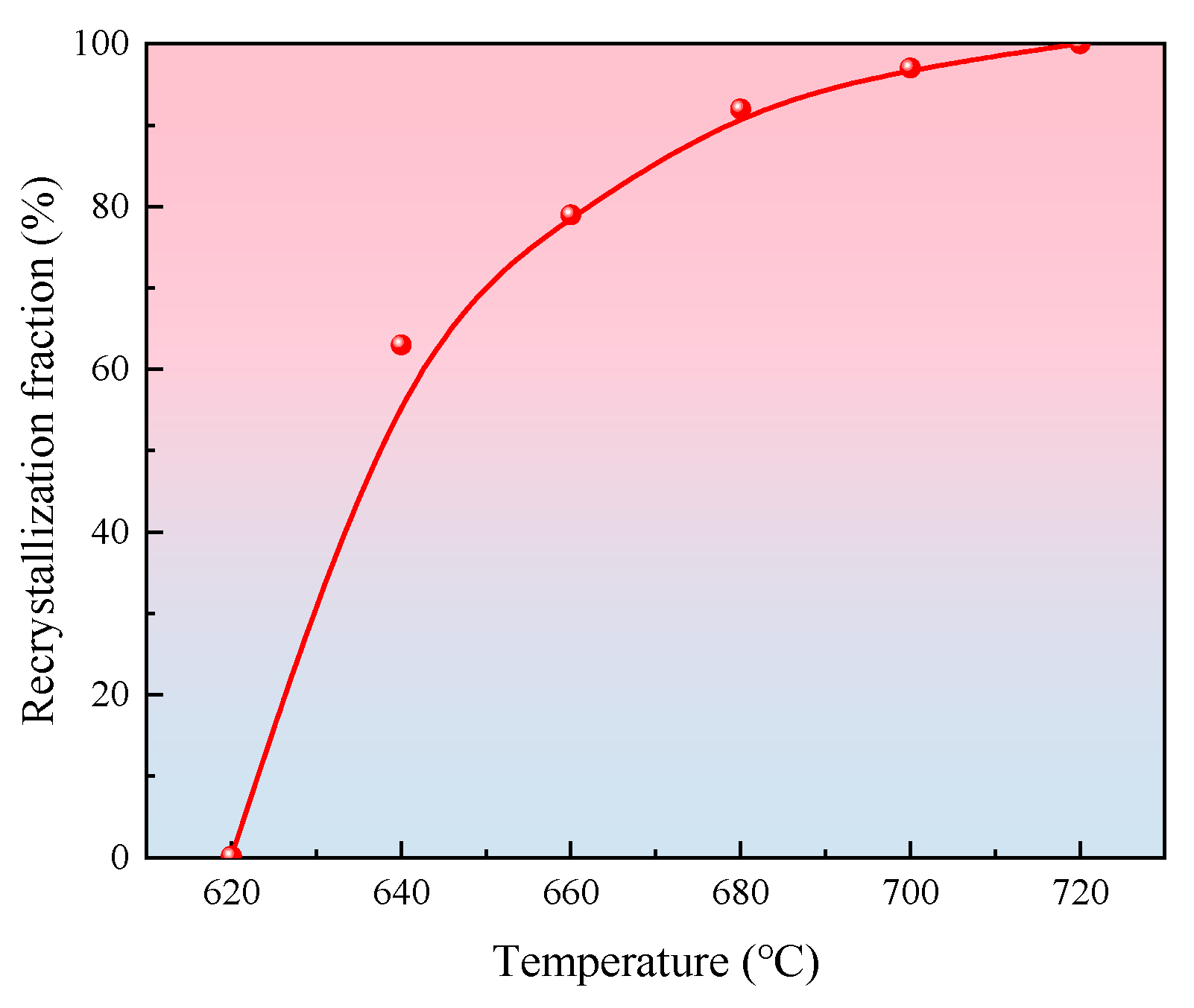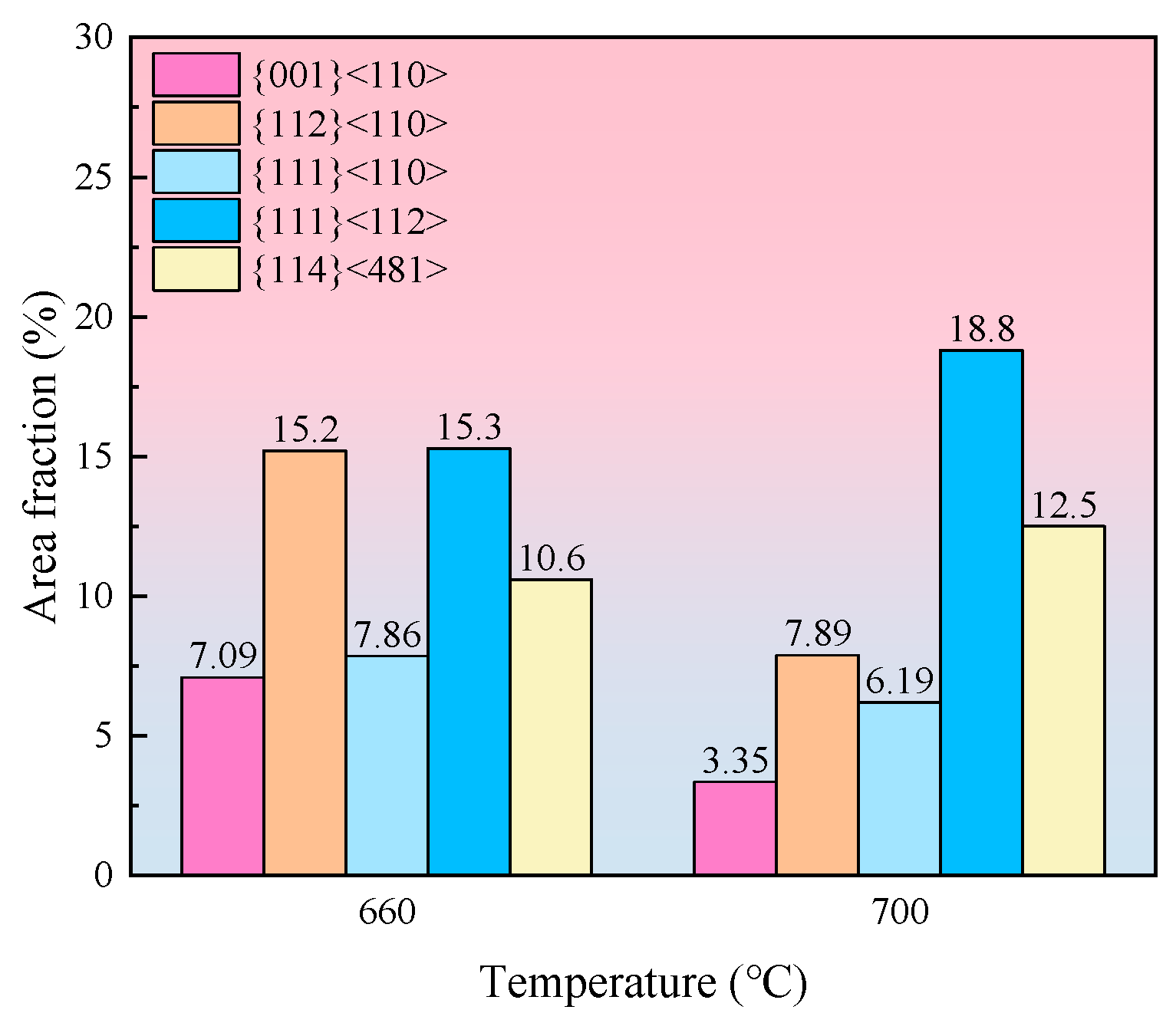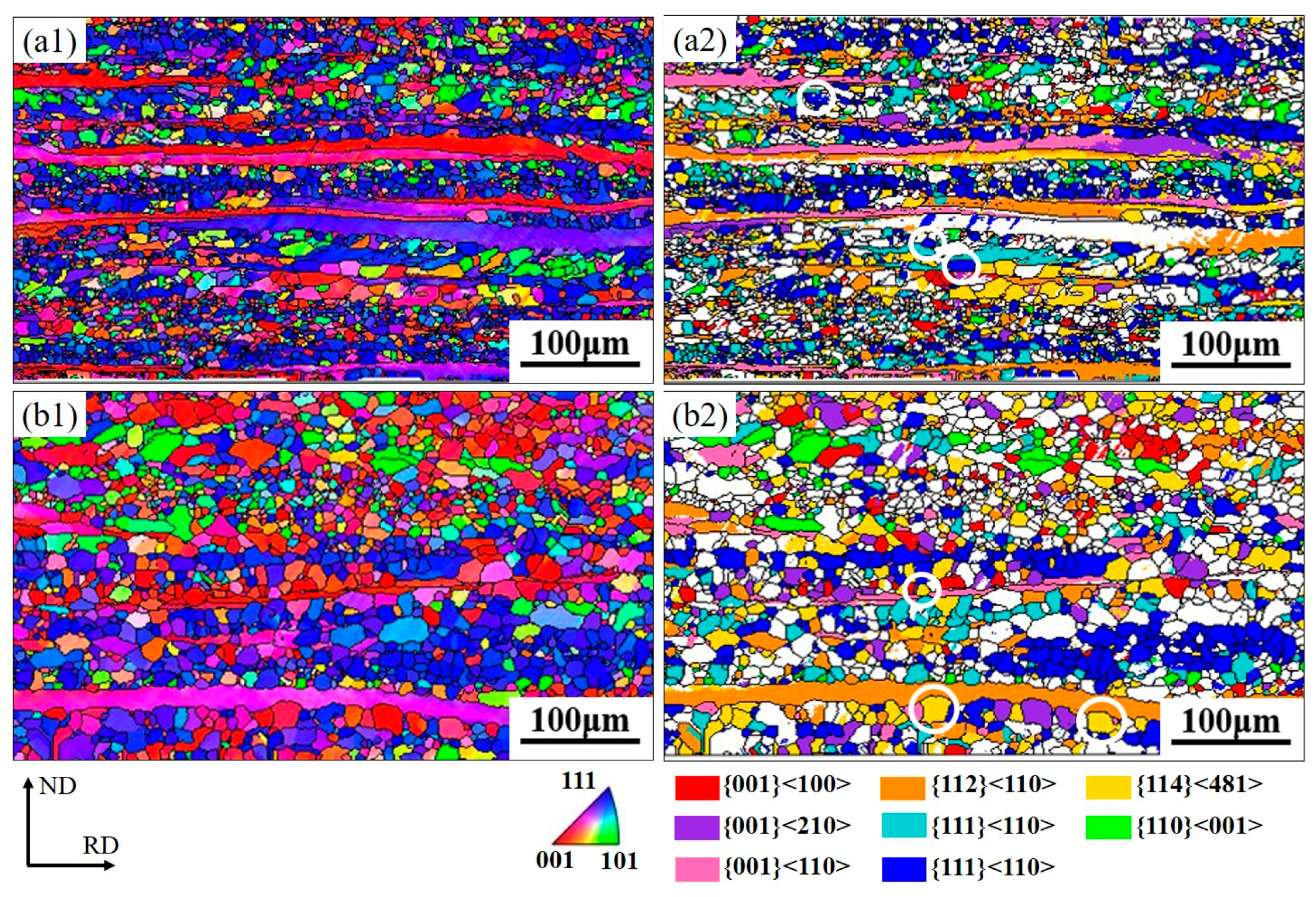 - Recrystallization of the cold-rolled sheet begins at 620 °C and completes at 720 °C. During this process, the original deformed microstructure is replaced by fine recrystallized grains. In the early stage of recrystallization, {111}<112> grains nucleate within the deformed {111}<110> matrix and progressively consume it. In the later stage, {114}<481> grains nucleate and grow at the grain boundaries of the deformed {112}<110> and {001}<110> matrix. After recrystallization, the {111}<112> and {114}<481> components become the dominant texture components in the annealed sheet, replacing the α-fiber texture observed before recrystallization.