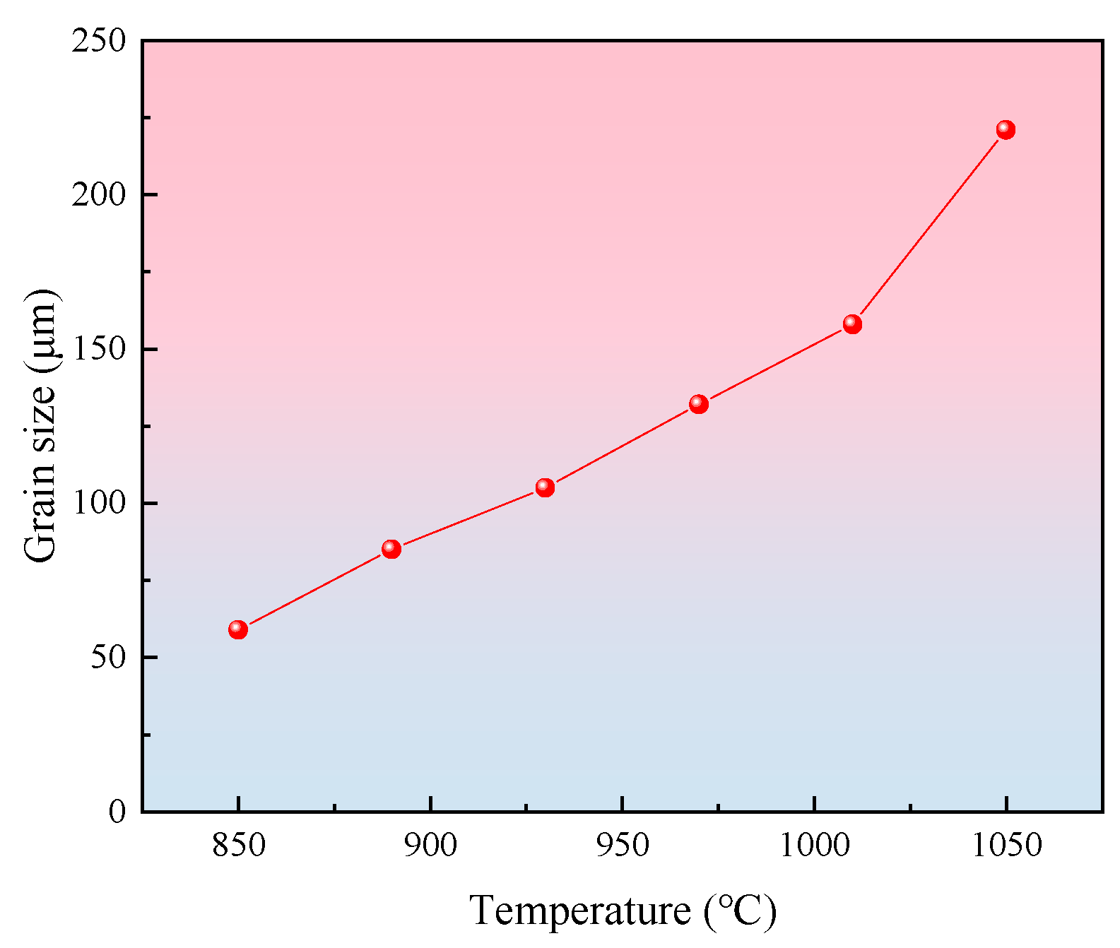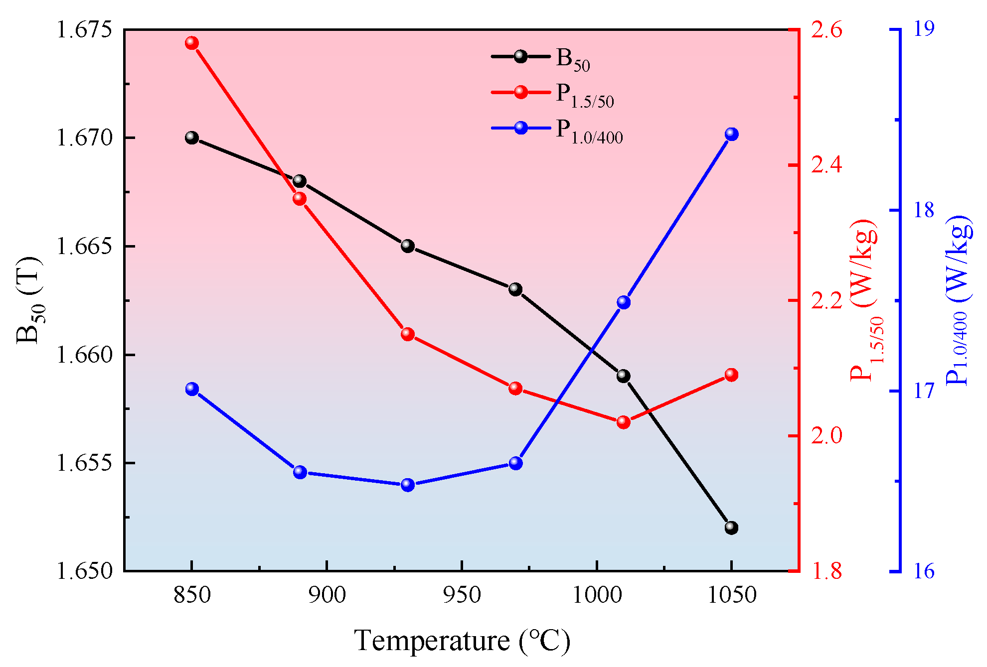 - There is an optimal grain size at which the total core loss reaches its minimum. At high frequencies, where eddy current loss dominates, the optimal grain size tends to decrease. With increasing annealing temperature, the core losses P1.5/50 and P1.0/400 of the non-oriented silicon steel initially decrease and subsequently increase, exhibiting minimum values at 1010 °C and 930 °C, respectively. The gradual decline in magnetic induction (B50) is attributed to the increase in average grain size.