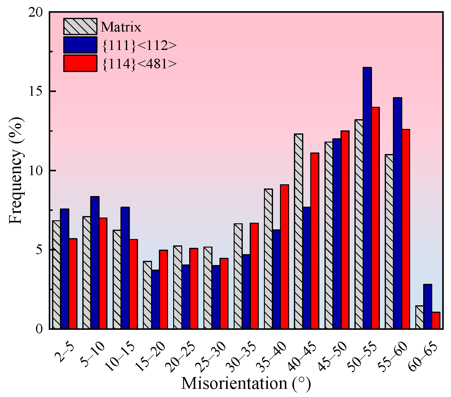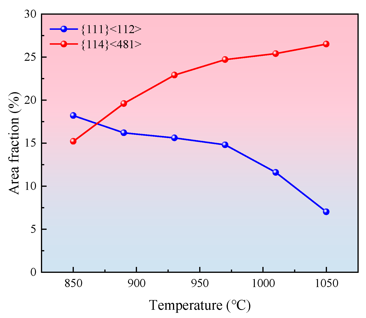 - From 850 °C to 1050 °C, the average grain size of the annealed non-oriented silicon steel sheet increases rapidly from 59 μm to 221 μm. During the grain growth process, the area fraction of {114}<481> grains surrounded by high-angle grain boundaries continuously increases, while that of {111}<112> grains surrounded by low-angle grain boundaries gradually decreases, due to high-angle grain boundaries exhibiting higher grain boundary mobility. As a result, the {114}<481> component becomes the dominant texture component in the annealed sheet at higher temperatures.