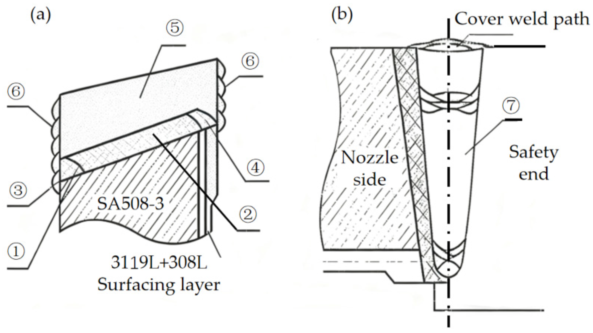 - Gao, Z.; Zhao, L.; Han, Y. Investigation on Residual Stress in SA508/Inconel Metal/CF8A Dissimilar Welded Joint for Nuclear Steam Generator Safe End Using Different Processes. Nucl. Technol. 2023, 210, 471–485. [Google Scholar] [CrossRef]