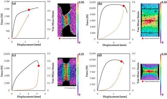 Figure 4 illustrates the force–displacement curves obtained from the tensile testing machine, alongside the corresponding strain evolution at the assumed fracture initiation point, as captured through Digital Image Correlation (DIC). Fracture initiation sites vary according to the imposed stress state. In the uniaxial tension and notch tension specimens (Figure 4b,d), fracture initiated near the geometric center, where the strain was concentrated in an inner region of the specimens. In the shear specimen (Figure 4a), the strain field was homogeneously distributed along a narrow shear band which formed a well-defined fracture line, whereas in the plane strain tension specimen, fracture occurred within the reduced width region as expected.