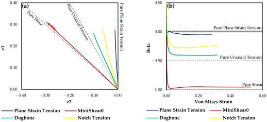 The strain path evolution at the fracture initiation point was evaluated through the relationship between major and minor strains (ε1-ε2) and the strain ratio β as a function of equivalent strain, as depicted in Figure 5. From Figure 5a, the slope of each strain path represents the strain ratio . The nearly linear evolution and close agreement with the theoretical ideal paths indicate minimal rotation of principal strain directions and stable loading conditions. In Figure 5b, the constant β with increasing equivalent strain confirmed the suitability of the minishear0, dogbone, and plane strain tension specimens for accurately reproducing their target stress states. Such proportional evolution minimizes the uncertainty introduced by non-linear strain paths and enhances the robustness of damage model parameter identification.