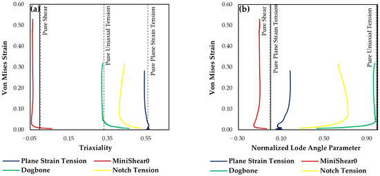 During plastic deformation, the stress state evolution was relatively stable across all specimens. As shown in Figure 6a, the stress triaxiality remained nearly constant throughout plastic deformation for all tests, confirming the proportional loading conditions indicated by the strain path analysis. The uniaxial tension specimen exhibited a triaxiality close to the theoretical value of 0.33, while the plane strain tension specimen almost reached 0.57, consistent with ideal conditions. The minishear0 specimen displayed a slightly negative triaxiality (≈−0.04), indicating a shear-dominated stress state. Even at higher equivalent strain, the triaxiality evolution remained constant. The notch tension specimen exhibited an intermediate and progressively increasing triaxiality, reflecting the transition from uniaxial tension toward plane strain tension as deformation localizes near the reduced width region.