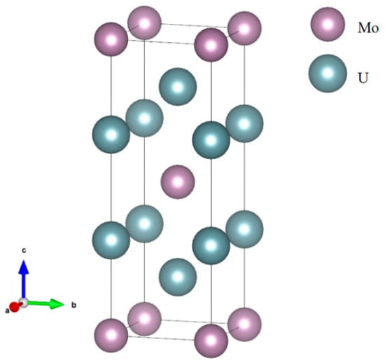 According to the equilibrium phase diagram, high-temperature γU-Mo decomposes upon cooling into orthorhombic α-U and tetragonal U2Mo (the γ′ phase), the latter adopting a MoSi2-type C11b structure [] as shown in Figure 1, which space group is I4/mmm. The γ phase, stabilized when Mo ≥ 7–10 wt%, has been widely adopted as a baseline for low-enriched uranium research reactor fuels [,,]. However, during thermal treatments, slow cooling, or irradiation-induced ordering, the γ′ phase may inevitably form []. Its layered ordering of U and Mo atoms significantly alters defect formation energies and diffusion pathways, thereby influencing the solubility, migration, and trapping of fission gases. The occurrence of γ′ domains introduces local instabilities within the γ matrix, accelerates bubble nucleation, and exacerbates swelling, ultimately affecting fuel reliability [,].