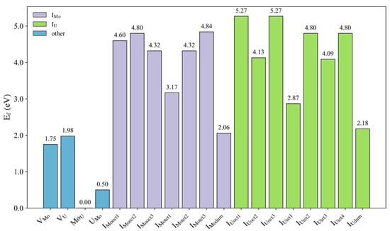 We constructed a 3 × 3 × 2 supercell for investigating the formation and diffusion of defects. During the continuous reaction process of U-Mo alloy nuclear fuel, the constant consumption of uranium atoms inevitably generates many defects. The U2Mo structure adopted in this study is a tetragonal crystal with the I4/mmm space group, which is widely used to describe experimentally observed phases in the U-Mo alloy system. Although this structure is not the thermodynamic ground state in first-principles calculations at 0 K, it exhibits good kinetic stability under high-temperature conditions. It frequently appears in experiments, making it widely used in theoretical studies. It should be noted that due to its metastable nature, the chemical potential construction process may not fully satisfy thermodynamic stability constraints. This study employs the standard states of elements as chemical potential references to calculate defect formation energies, as shown in Figure 2. There are four basic point defects in U2Mo: uranium vacancy (VU), molybdenum vacancy (VMo), U substitutional defect on Mo site (UMo), and Mo substitutional defect on U site (MoU). In addition to vacancy and substitutional defects, we calculated the formation energies of molybdenum and uranium interstitial defects, denoted as IMo and IU, respectively, as shown in Figure 2. Since U2Mo in this study is metastable, the following defect formation energies are analyzed based on its existence.