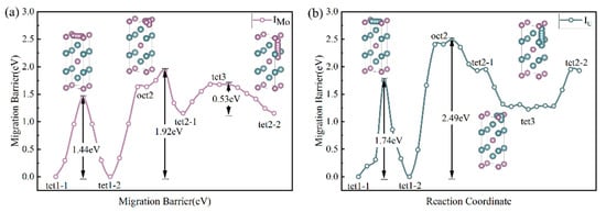 As shown in Figure 4e,f, this study takes the dumbbell configuration, formed by U and Mo atoms occupying the 2a sites along the <110> direction, as the initial and final states. It constructs their migration paths to the first and second nearest neighbors. A diffusion energy barrier map was constructed for U and Mo, covering multiple octahedral and tetrahedral interstitial sites, to further elucidate the global migration pathways of interstitial atoms. We systematically calculated each path’s energy barriers and identified typical transition processes (O → T, T → O, T → T, etc.) and their barrier distributions. In Figure 5a,b, interstitial atoms achieve long-range diffusion through multistep hopping. At the same time, the differences in energy barriers among various pathways show the connection probabilities between sites and the relative advantages of migration directions. As shown in Figure 5a,b, the linear migration from tet2 → tet1 passes through a dumbbell interstitial site, where the formation energy of the dumbbell interstitial is lower than that of tetrahedral and octahedral interstitials, leading to a collapse of the energy barrier. Consequently, we insert an octahedral interstitial site midway.