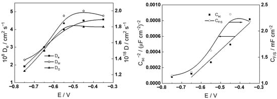 The evolution of estimated parameters with potential during anodic polarization in the two studied electrolytes (Figure 11 and Figure 12) allows us to draw the following conclusions: