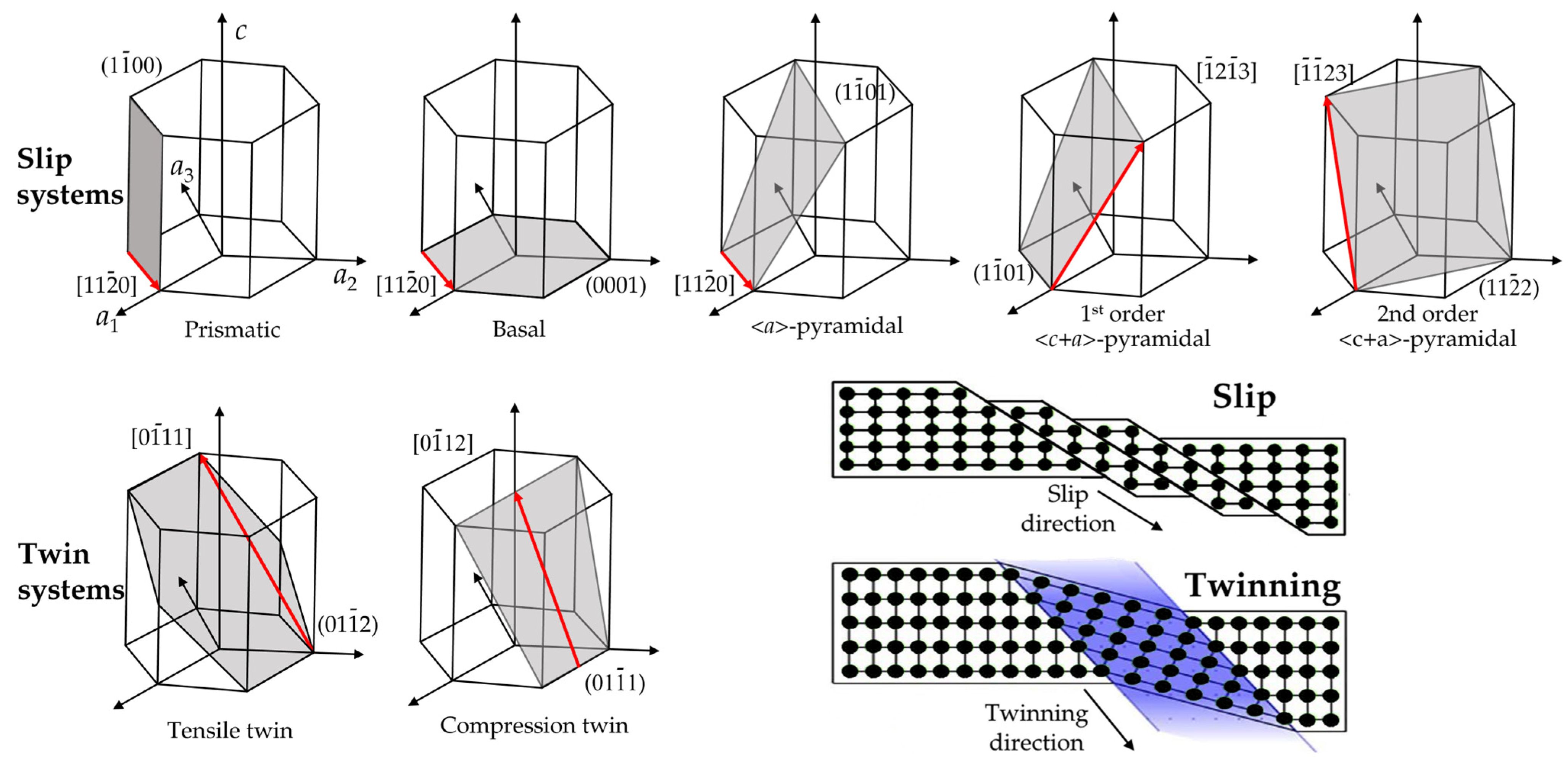 Metals with a hexagonal close-packed (hcp) crystal lattice—such as titanium, magnesium, zirconium, and their alloys—exhibit pronounced plastic anisotropy at the grain scale [1]. This behavior stems from the inherently low symmetry of the hcp lattice, which limits the number of crystallographic slip systems available for plastic deformation. In general, five distinct slip modes can be activated in hcp metals: prismatic (three slip systems), basal (three slip systems), <a>-pyramidal (six slip systems), first-order <c+a>-pyramidal (twelve slip systems), and second-order <c+a>-pyramidal (six slip systems) (Figure 1).