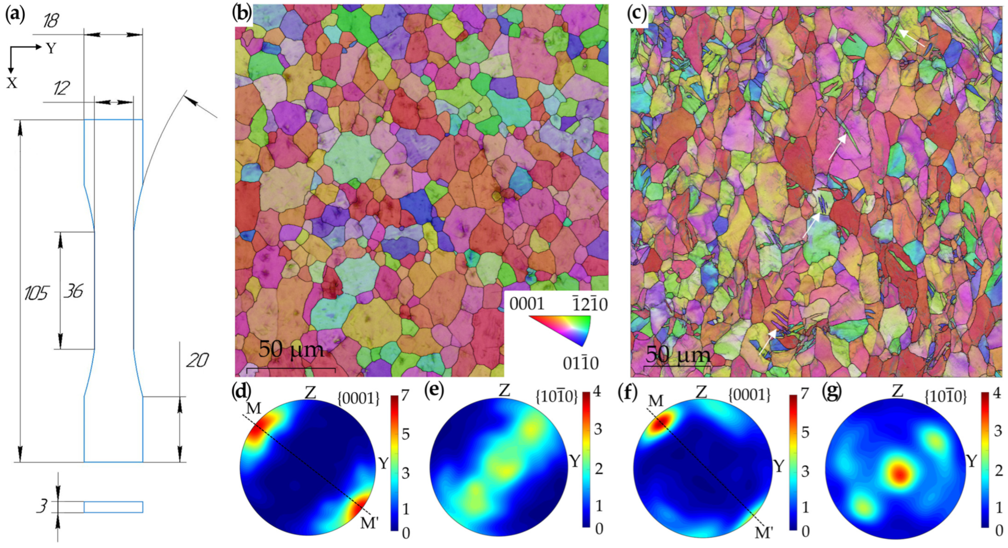 Figure 2. Specimen geometry (a), experimental microstructures (b,c), and corresponding {0001} (d,f) and { 10 1 ¯ 0 } pole figures (e,g) for an α-titanium specimen before (b,d,e) and after 30% uniaxial tension (c,f,g); twins are marked by white arrows, and MM′ is the texture axis.