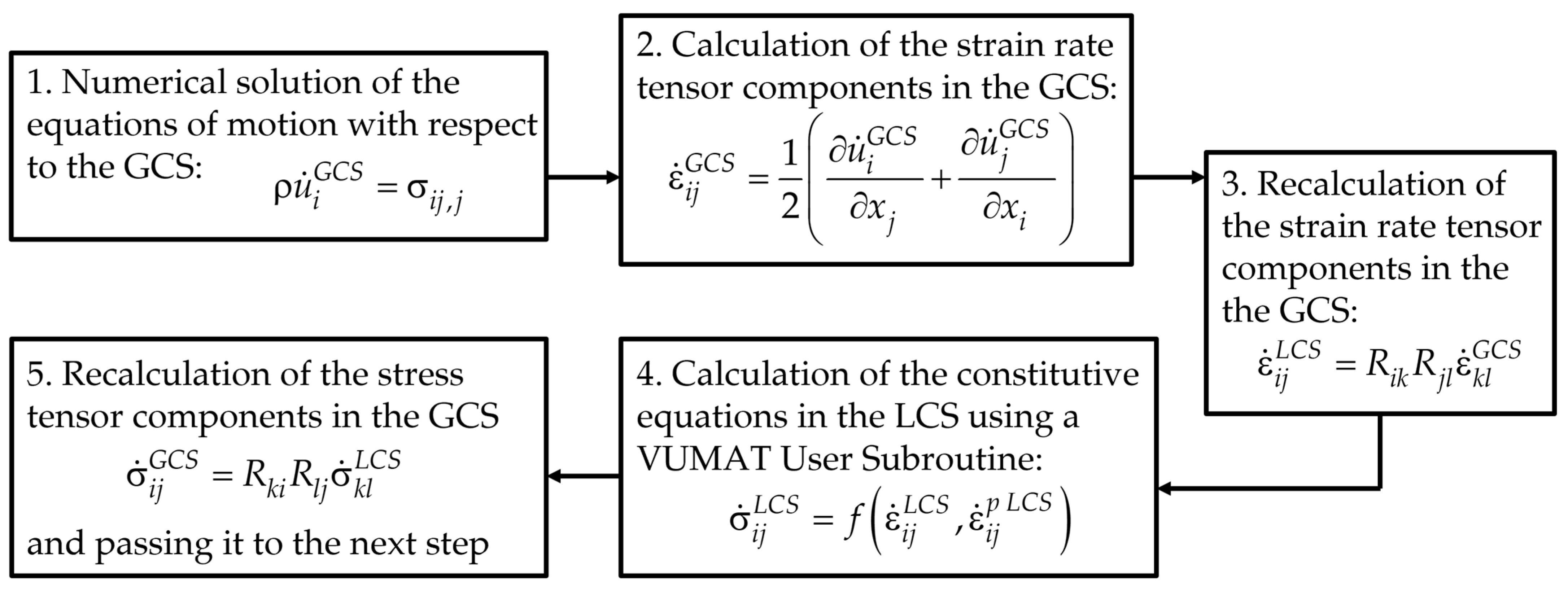 The constitutive equations are incorporated into the finite element package ABAQUS/Explicit (2019, Dassault Systèmes, Vélizy-Villacoublay, France) through a user subroutine VUMAT. Generally, the computation follows the scheme shown in Figure 3. This procedure is performed for all finite elements at each time increment. Note that in every finite element, the LCS undergoes a rigid-body rotation together with the material, while remaining orthonormal.