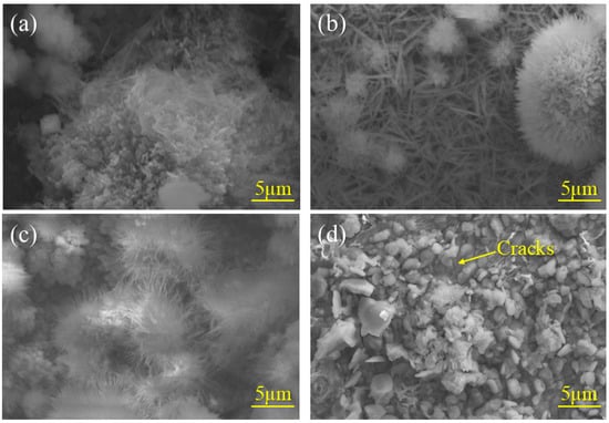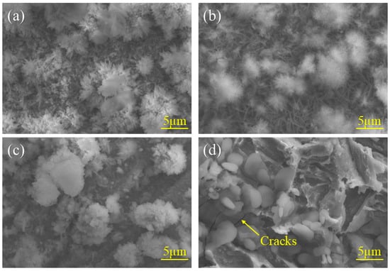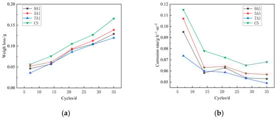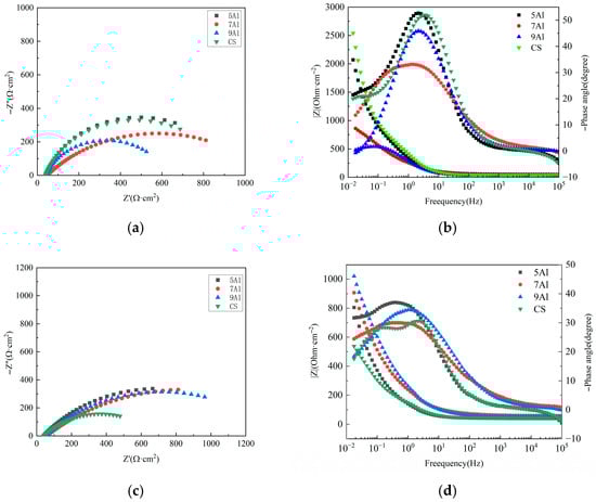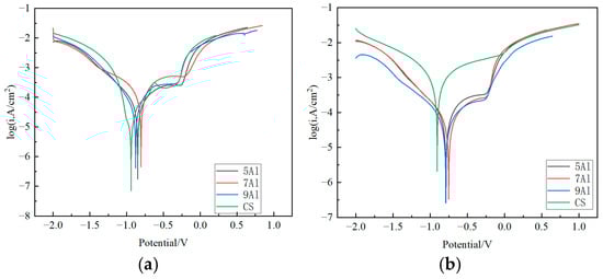 - The counter electrode is a platinum electrode with an exposed area of 0.5 cm2. Before the electrochemical test, the working electrode was subjected to an open circuit potential test for 1 h to ensure that the three-electrode system was in a steady state. The parameters of the Tafel test were as follows: the test potential range was set to −2.0~1.0 V, and the scanning rate was 0.01667 mV/s. The parameters of the electrochemical impedance test were as follows: the frequency range was set to 105 Hz~10−2 Hz, and the applied disturbance potential amplitude was ±10 mV.