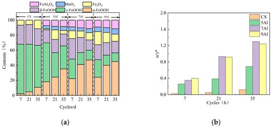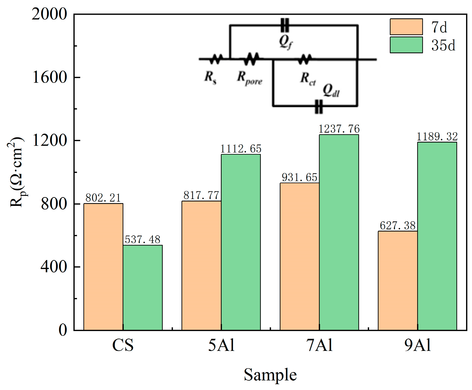 - The electrochemical stability of Al-containing steels is significantly better than that of CS. The 7Al steel has the highest Rp value (1237.76 Ω·cm2), and the charge transfer resistance (Rct) and rust layer pore resistance (R(pores)) increase simultaneously, indicating that its rust layer has the strongest blocking effect on electrochemical reactions and the best corrosion resistance.