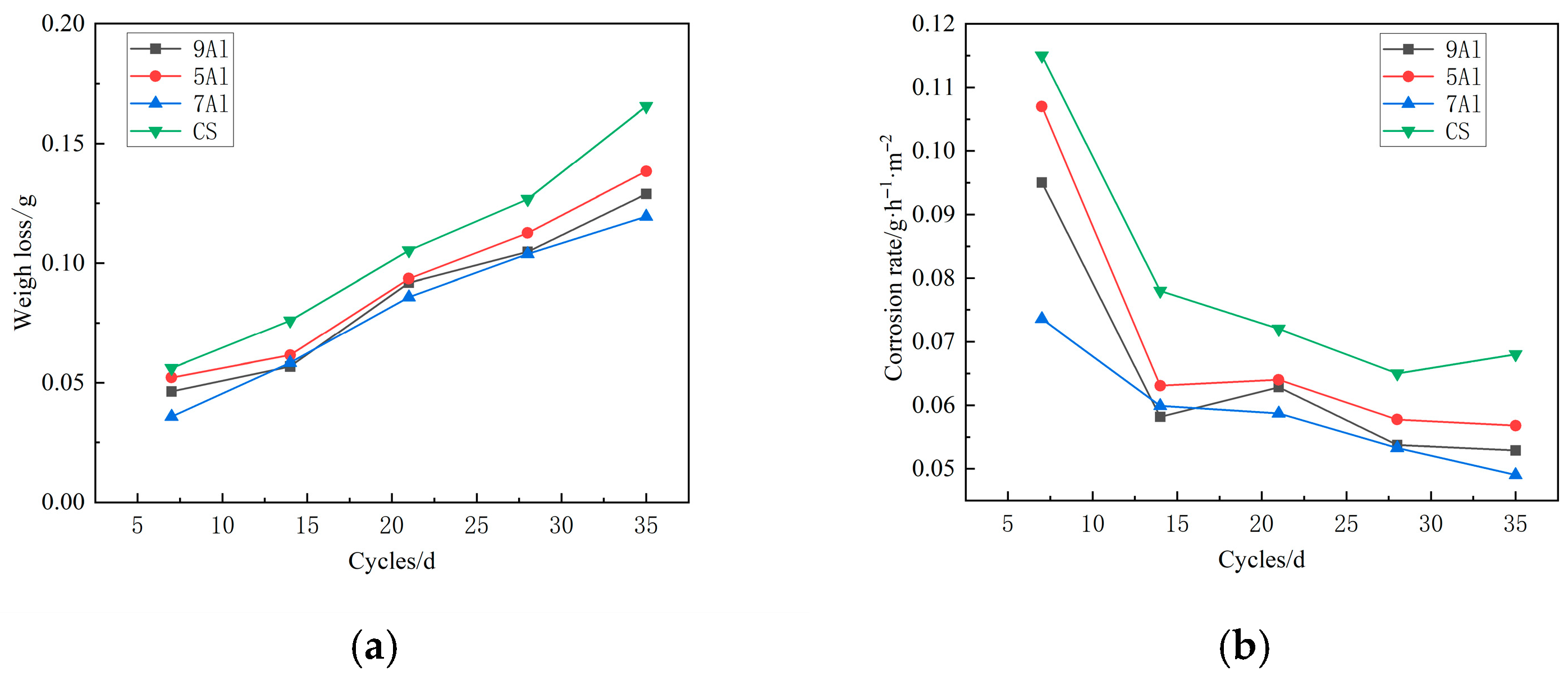 - The addition of Al can significantly reduce the corrosion weight loss and corrosion rate of steel among 5~9%Al contents. Among them, 7Al steel and 9Al steel have the lowest and similar corrosion rates, and the corrosion resistance has increased by two times. Hence, 7% Al content is the key threshold for improving corrosion resistance.