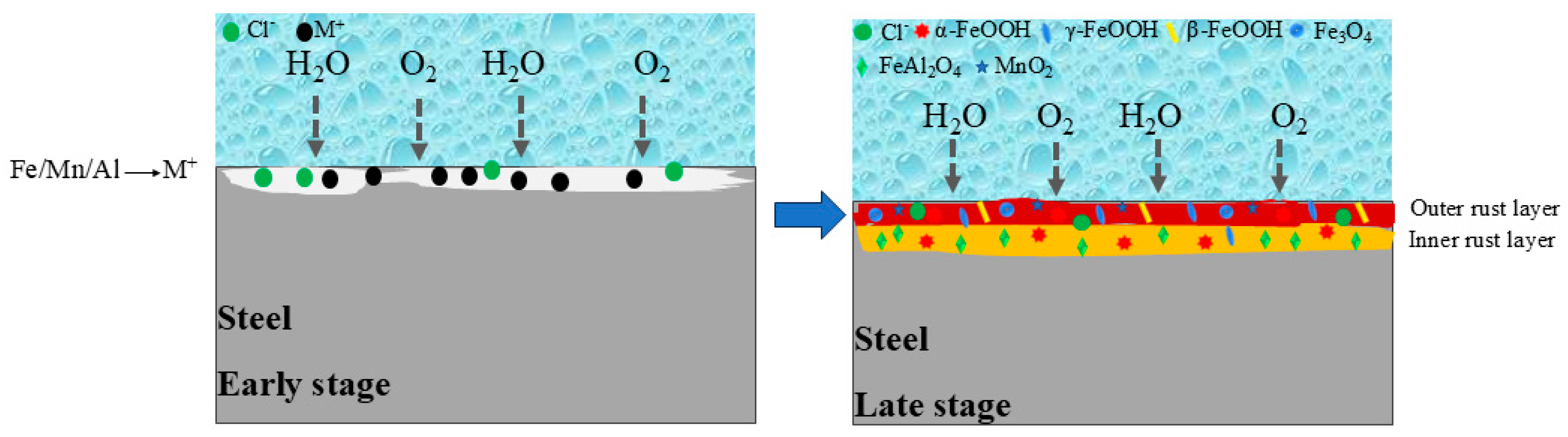 - Tang, Y.; Li, B.; Ji, P.; Zhang, X.; Ma, M.; Liu, R. Benefit of the rust layer formed on AlMn lightweight weathering steel in industrial atmosphere. Constr. Build. Mater. 2023, 394, 15. [Google Scholar] [CrossRef]