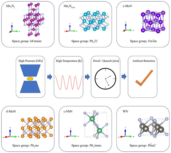 Representative bulk TMN structures and an HPHT pressure–temperature–time (P-T-t) pathway. In all TMN structures shown (e.g., Mn3N2, Mn2N0.86, γ/δ-MoN, ε-NbN, WN), the colored spheres represent transition-metal atoms, whereas the white spheres represent N atoms.