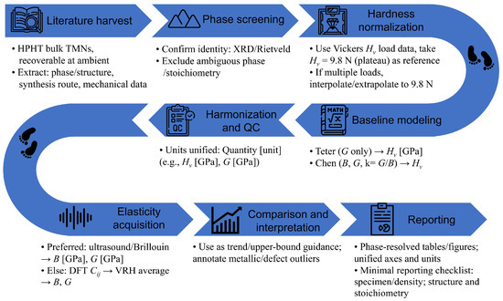 We harmonize the reported Vickers hardness to the 9.8 N plateau (interpolating/extrapolating within published load curves where needed). Elastic parameters follow an acoustic-first policy (ultrasound/Brillouin preferred); when unavailable, reported Cij values are converted to VRH averages B, G for comparability. Quantitative benchmarking uses elasticity-based baselines Teter and Chen. Only bulk data enter the regressions; thin-film values, when mentioned for the mechanism, are excluded from fitting. Figure 2 summarizes the pipeline, and Table 2 lists the model inputs/outputs.