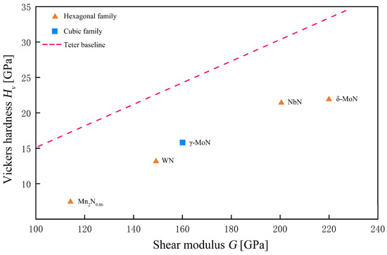 Although the specimen size is modest, Table 3 spans the key structural families we care about: hexagonal family (ε-NbN, δ-WN, δ-MoN), cubic γ-MoN, and low valent Mn nitrides Mn2N0.86. This is sufficient to test, under a unified protocol, two points: (i) indentation hardness primarily tracks the shear modulus G, and (ii) the bulk modulus B is not predictive by itself and enters via the Pugh ratio k = G/B. Based on Table 3 data, Figure 3 plots Hvexp vs. G with the Teter baseline to reveal shear-dominated behavior and downward shifts from metallicity/defects. Figure 4 is a parity plot of Chen prediction vs. the experiment (1:1 guideline), assessing the agreement of the elastic baseline and diagnosing phase-specific deviations.