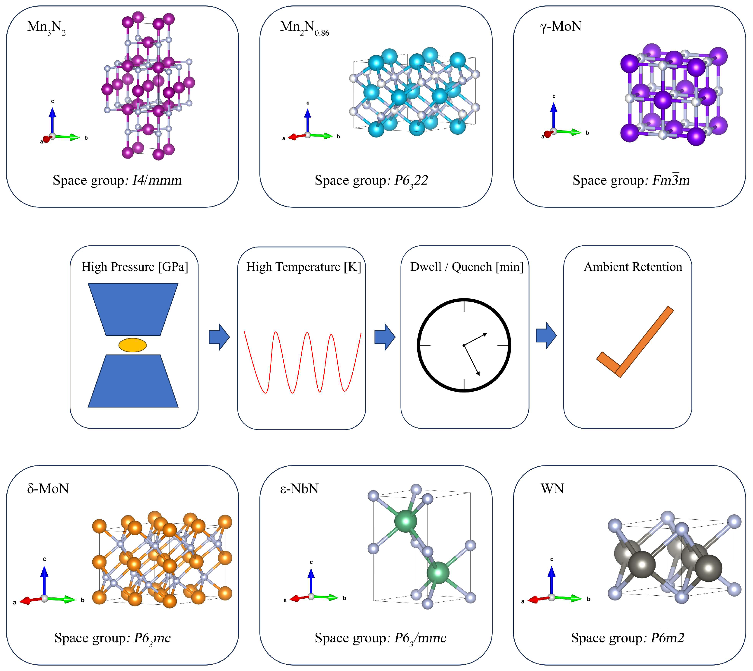 | Hexagonal ε-NbN [28] | NbN | P63/mmc | 10 [GPa]/1373 [K]/90 [min] | 21.5 GPa |