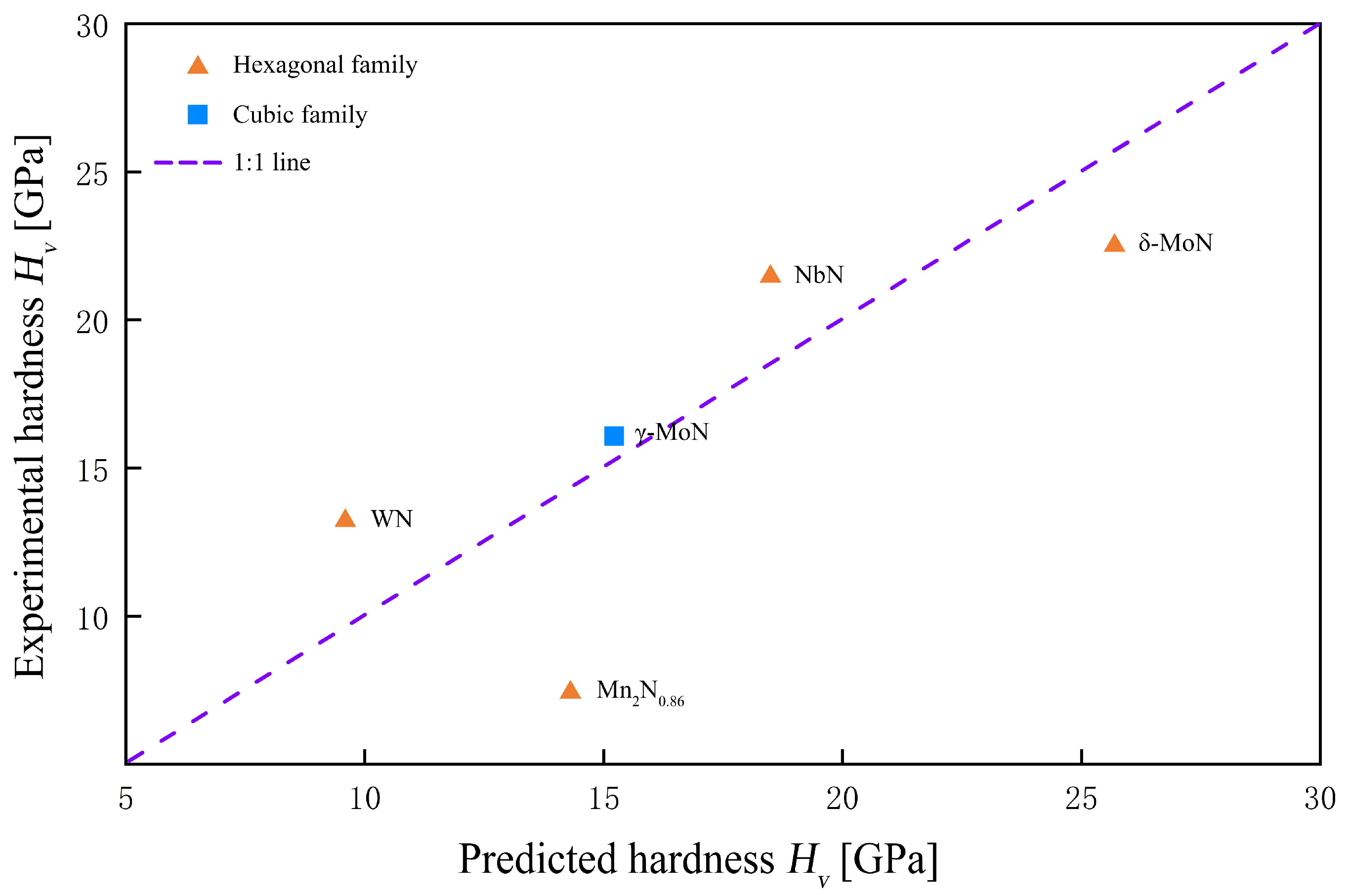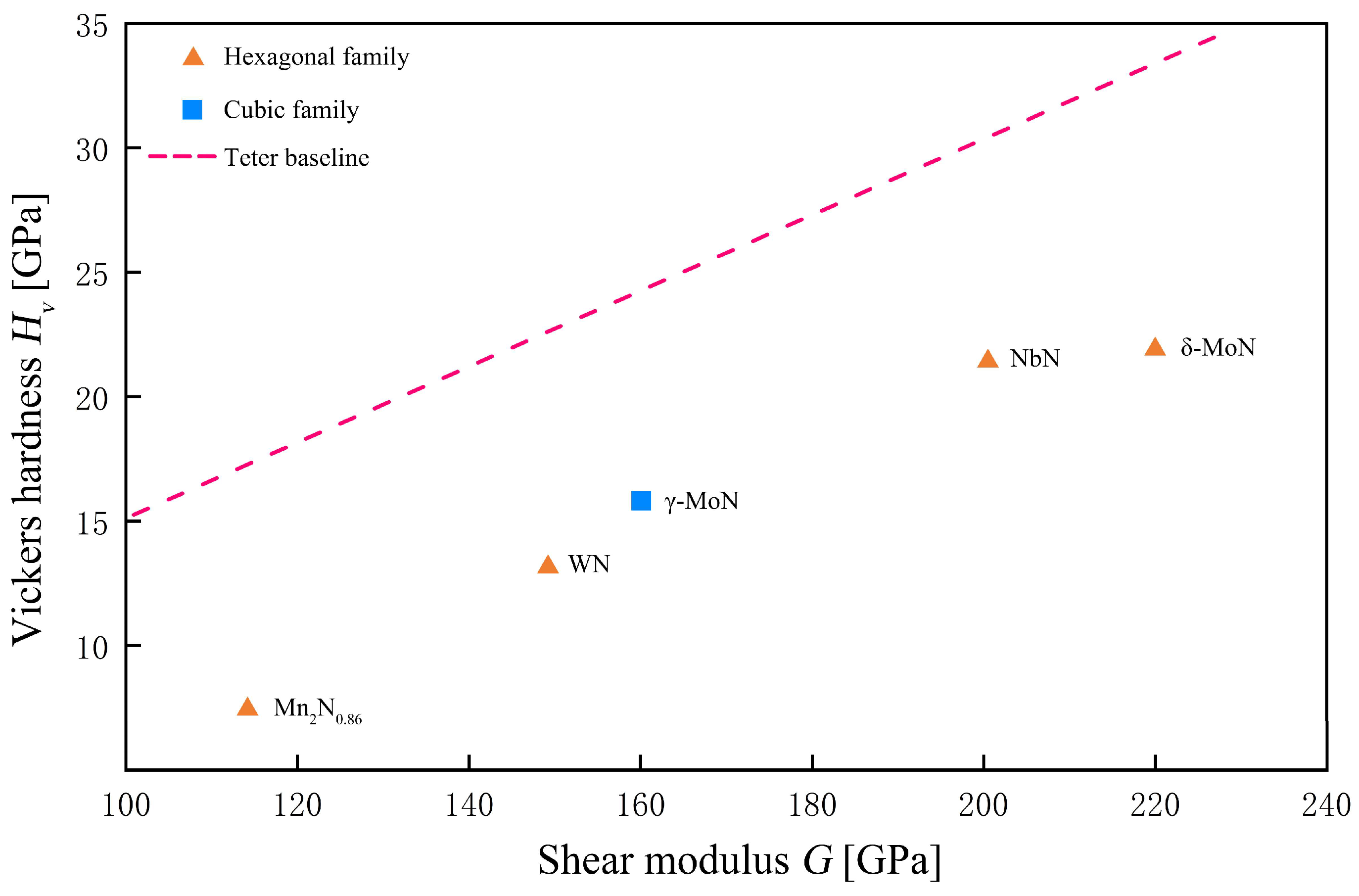- B is not a predictor of hardness on its own. Indentation hardness correlates more robustly with the shear modulus G, while B influences hardness indirectly through the Pugh ratio k = G/B. Parity plots place δ-WN, ε-NbN, and γ/δ-MoN close to or below the 0.151G line, with the multi-grain correction Hv = 2(k2G)0.585 − 3 often capturing the experimentally observed plateaus.