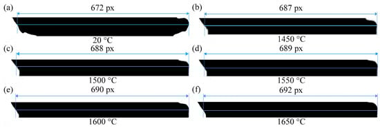 The measured pixel lengths of the maximum outer diameter of the alloy ring at room (a) and experimental (b–f) temperatures in run 4#.