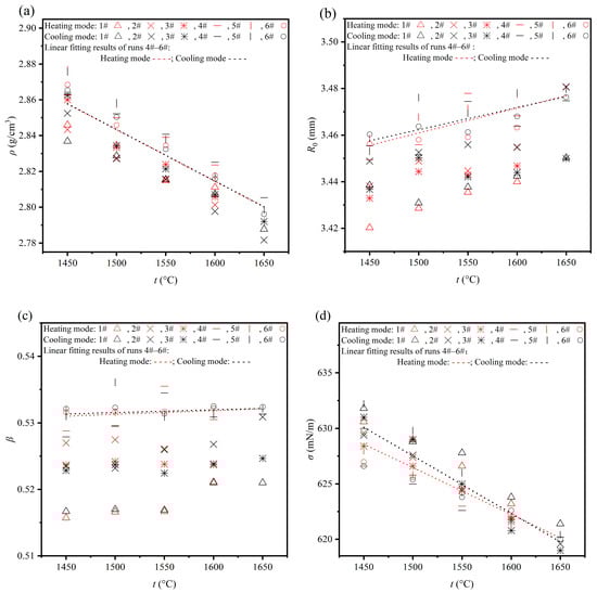 Figure 5 presents the variations in the measured ρ, R0, β, and σ values with temperature under both heating and cooling modes in six experiments. For each experiment, the data at each temperature under each mode represent the average of five measured values after holding at that temperature for different times (refer to Table 3). Under the same temperature conditions, it was found that when the droplet mass was relatively small (in runs 1#–3#), the values of ρ, R0, and β increased, while the σ value decreased; when the droplet mass was relatively large (in runs 4#–6#), with the increase in droplet mass, the values of ρ, R0, β, and σ did not show obvious regular changes. It should be noted that the mass of the adhered slag was neglected in run 3#, making the actual mass of the droplet smaller than that in run 2#. Theoretically, the ρ and σ values should not vary with the droplet mass. However, this was not the case when the droplet mass was relatively small, indicating the presence of systematic errors during the measurement process. When the droplet mass was relatively large, the results became independent of the droplet mass, but some fluctuations were still observed, indicating the presence of accidental errors.