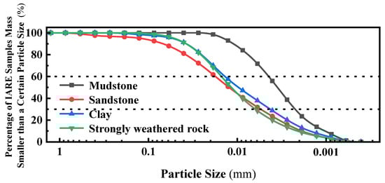 Table 2 presents the specific surface area (S), cation exchange capacity (CEC), and specific gravity (Gs) of the four IARE samples. Notably, Mudstone exhibits the highest specific surface area, which is approximately twice that of the other three IARE types. However, its cation exchange capacity is approximately half that of the other three IARE types. The specific surface areas of all four IARE samples range from 2.63 to 2.76. Using the ratio method to calculate the surface charge per unit specific surface area, the values for the Mudstone, Sandstone, Clay, and weathered rock are as follows: 0.7072 × 10−2 mmol/m2, 1.9620 × 10−2 mmol/m2, 1.5418 × 10−2 mmol/m2, 2.1003 × 10−2 mmol/m2, respectively. Among these values, the weathered rock exhibits the highest surface charge per unit specific surface area, while the Mudstone demonstrates the lowest value.