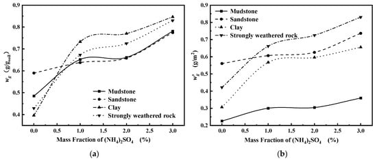 Figure 6b depicts the trend of the mass of adsorbed bound water per unit area with varying concentrations of ammonium sulfate. The unified factor used in this study is the specific surface area of dehydrated Clay minerals, which encompasses various particle properties crucial for studying soil–water suspension systems. The observations from the figure are as follows: (1) When adsorbing deionized water, the trend of mass of adsorbed bound water per unit area is as follows: Sandstone > Strongly weathered rock > Clay > Mudstone, with masses of 0.5605 g/m2, 0.4215 g/m2, 0.3065 g/m2, and 0.2258 g/m2, respectively. (2) When adsorbing ammonium sulfate solution, the trend of mass of adsorbed bound water per unit area is as follows: Strongly weathered rock > Sandstone > Clay > Mudstone. At a mass fraction of 1%, the masses of adsorbed bound water are 0.6615 g/m2, 0.6062 g/m2, 0.5669 g/m2, and 0.3000 g/m2, respectively. (3) Strongly weathered rock and Sandstone exhibit similar specific surface areas. Through calculations, the specific surface area of Strongly weathered rock is determined as 2.1003 × 10−2 mmol/m2, while that of Sandstone is 1.9620 × 10−2 mmol/m2. The higher specific surface area of Strongly weathered rock results in a higher adsorbed bound water content when adsorbing ammonium sulfate. This indicates that the quality of adsorbed-bound water on the surface of IARE particles is influenced not only by their specific surface area but also by the surface charge they carry.
