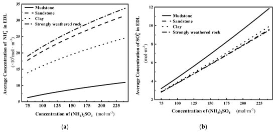 Based on Equations (7)–(9), the average concentration of adsorbed ions on the unit area of Clay particles in each system was calculated and presented in Figure 8. The following observations can be made: (1) The average concentrations of ammonium ions and sulfate ions in the electric double layer increase with the increase in bulk solution concentration. Notably, the average concentration of ammonium ions is much higher than that of sulfate ions. This indicates that ammonium ions play a dominant role in contributing to the mass of the electrolyte within the double layer. (2) The formation of the adsorbed water film on the surface of Clay particles is influenced by both the bulk solution concentration and the surface charge density of Clay particles []. Clay particles possess a significant amount of negative charge due to factors such as isomorphous substitution and broken bonds, resulting in a strong negative electric field on their surfaces. With a constant electric field on the Clay particle surface, the thickness of the double layer decreases as the bulk solution concentration increases. However, the average concentration of cations also increases with the concentration, leading to a higher density of the water film. As a result, the mass of the adsorbed water film increases with the increase in bulk solution concentration. The quantity of adsorbed ions on Clay particles depends on their charge, while the strength of ion adsorption relies on the surface charge density []. Isomorphous substitution refers to the replacement of certain cations in the crystal structure of clay minerals (e.g., montmorillonite, illite) by cations of similar size but different valence during mineral formation. In the mineral lattices of the ore soil particles, such substitution occurs—for example, Al3+ replacing Si4+ in the Si–O tetrahedral sheet, and Mg2+ or Fe2+ replacing Al3+ in the Al–O octahedral sheet. These substitutions create a deficit of positive charge, or equivalently an excess of negative charge, resulting in a net negative charge on the particle surfaces. On the unit area of Clay particles, a higher charge corresponds to a larger surface charge density, enabling the Clay particles to firmly adsorb more cations. When the surface charge density of Clay particles is higher, the density of the adsorbed water film on the surface also increases, resulting in a higher mass of adsorbed-bound water. Therefore, among the four IARE samples, the Strongly weathered rock with the highest surface charge density exhibits a higher adsorbed-bound water content, while the shale, which has the lowest surface charge density, shows the least amount of adsorbed-bound water.