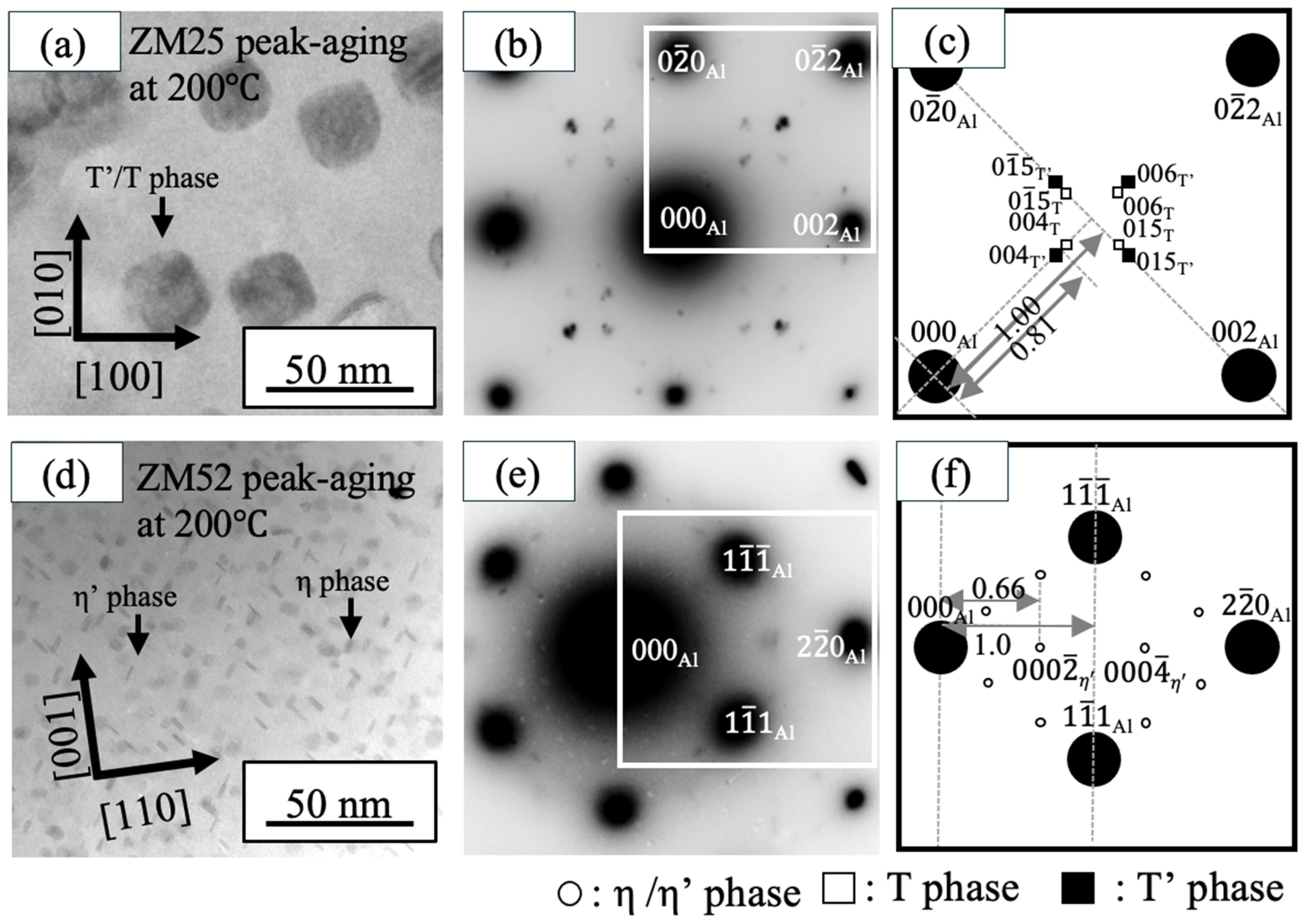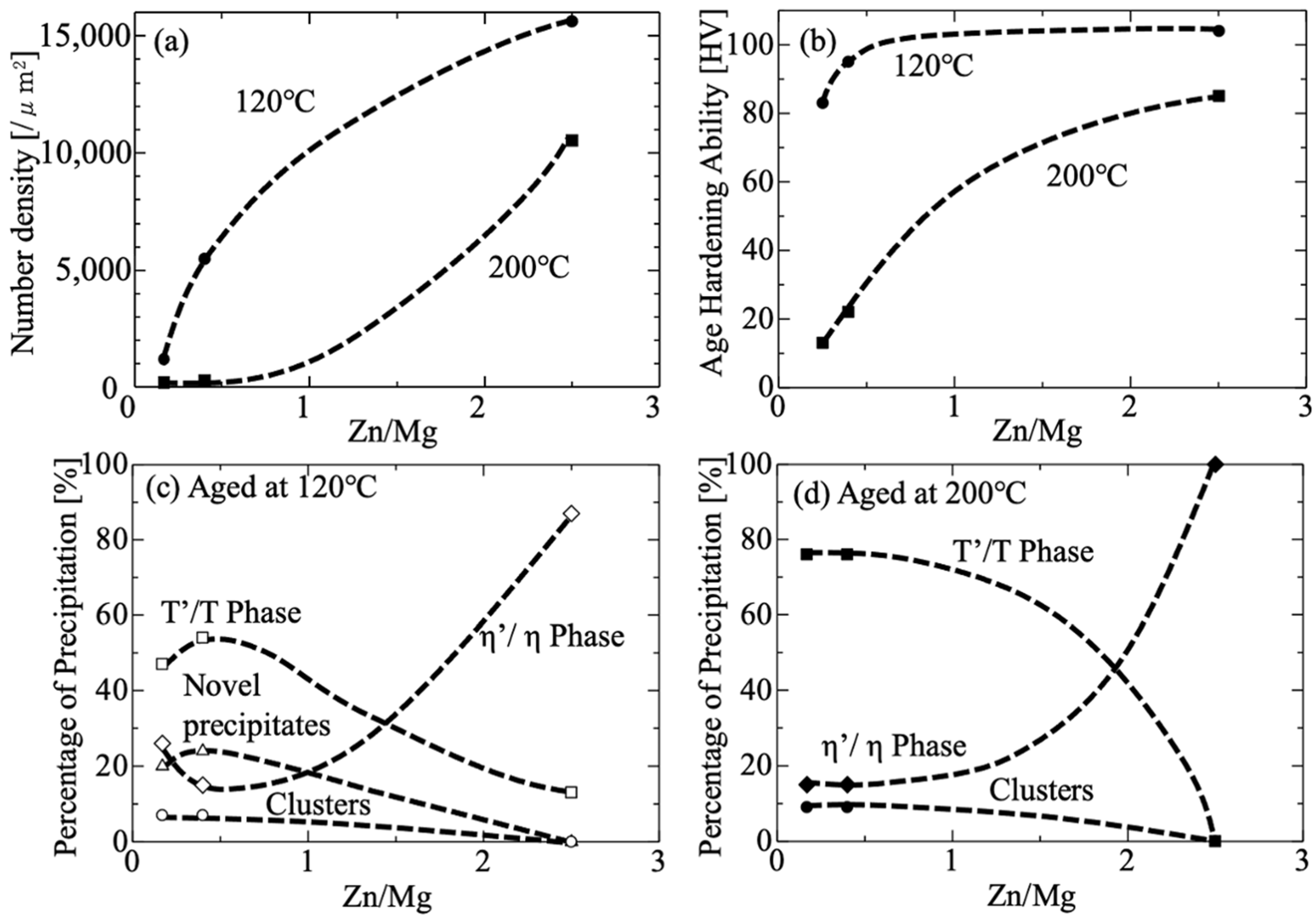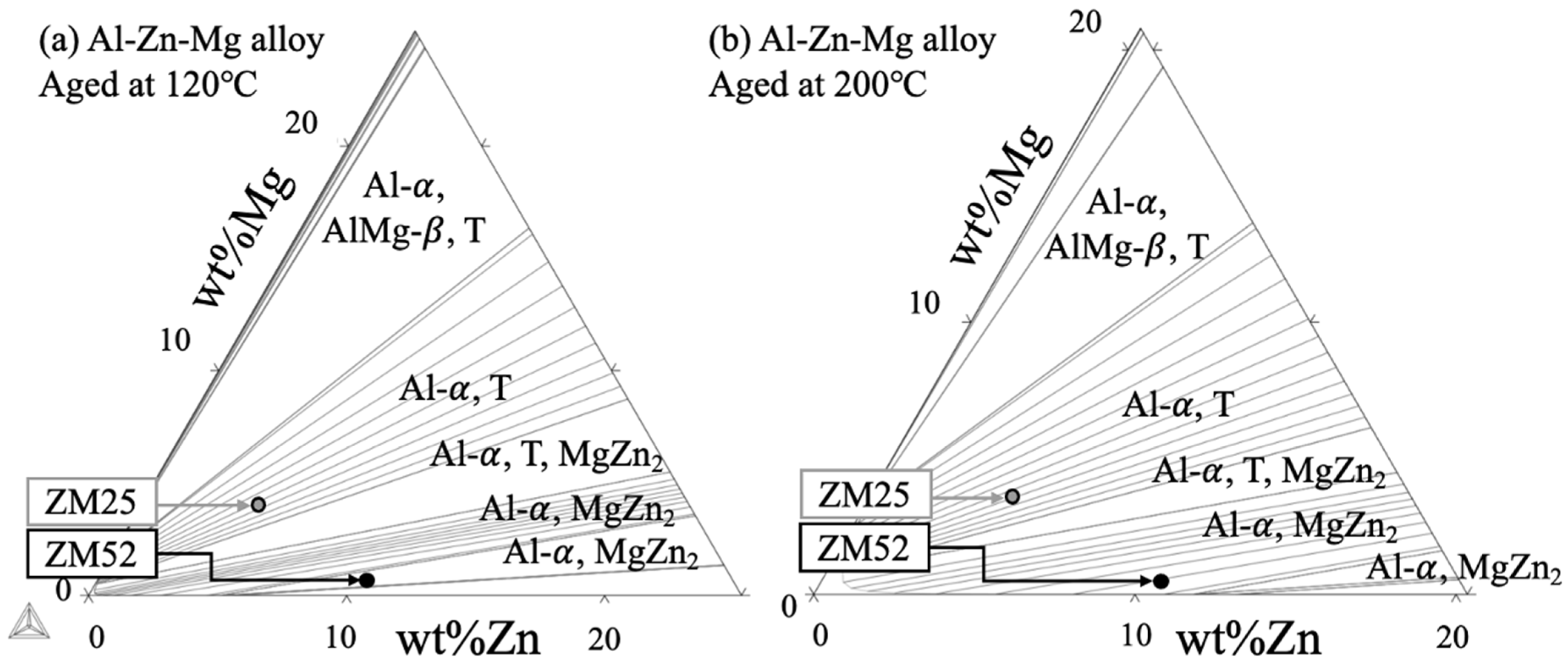 - Alloys with Zn/Mg < 1.0 (ZM25) aged at both 120 °C and 200 °C primarily contain T′/T phases as the dominant strengthening precipitates, followed by η′/η phases. The variation in their number density influences the resulting hardness. In contrast, the high-Zn/Mg alloy (ZM52, Zn/Mg > 2.0) predominantly forms η′/η phases as the main strengthening precipitates at both temperatures.
