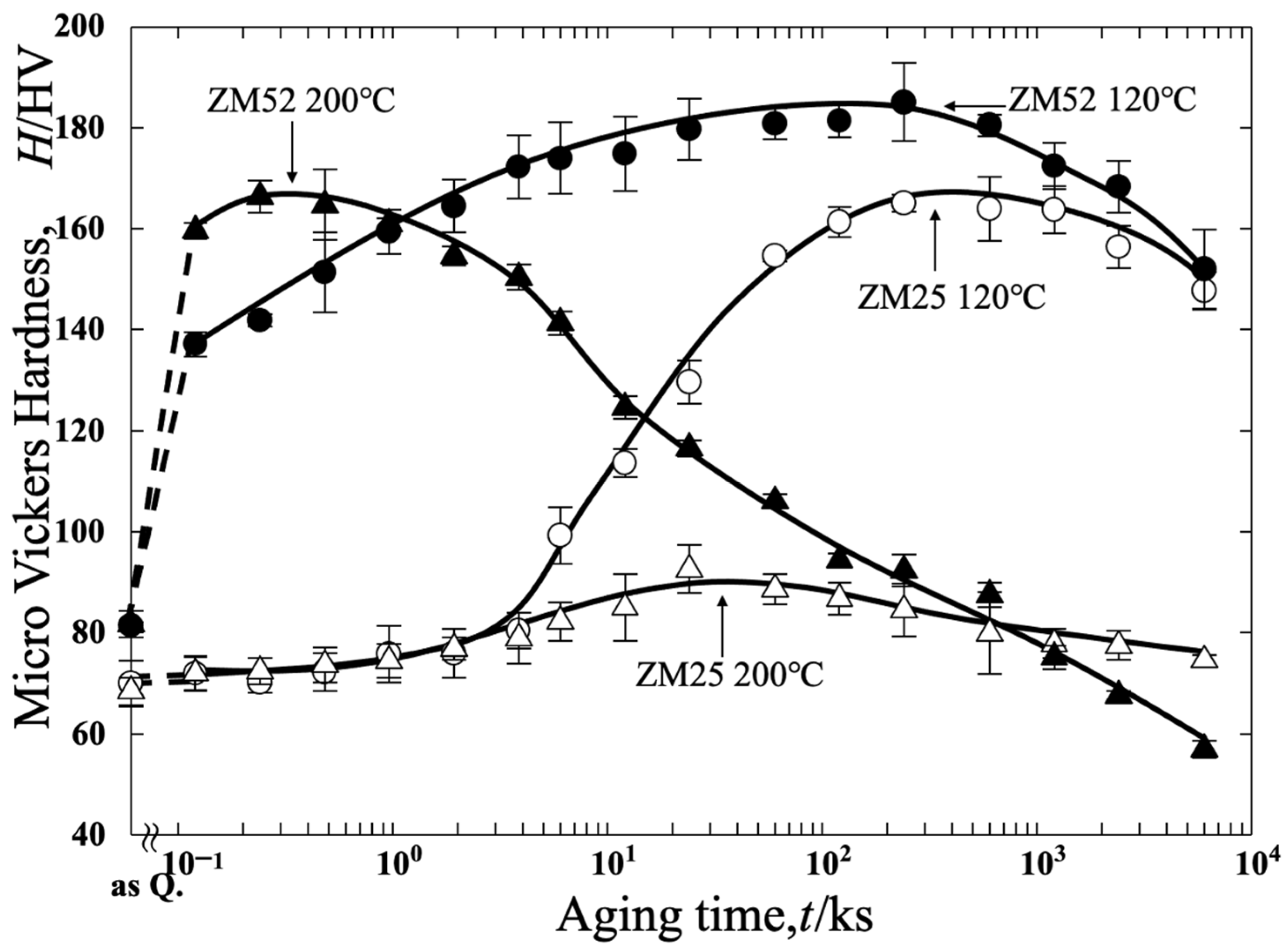 - According to the Vickers Hardness results, the ZM52 alloy exhibits higher as-quenched hardness than ZM25. While both alloys show comparable age-hardening responses at 120 °C, the difference becomes more obvious at 200 °C. ZM52 achieves significantly greater hardening, whereas ZM25 exhibits only a slight increase followed by gradual softening. ZM52 also shows faster cluster formation and reaches peak hardness earlier, particularly at 200 °C.