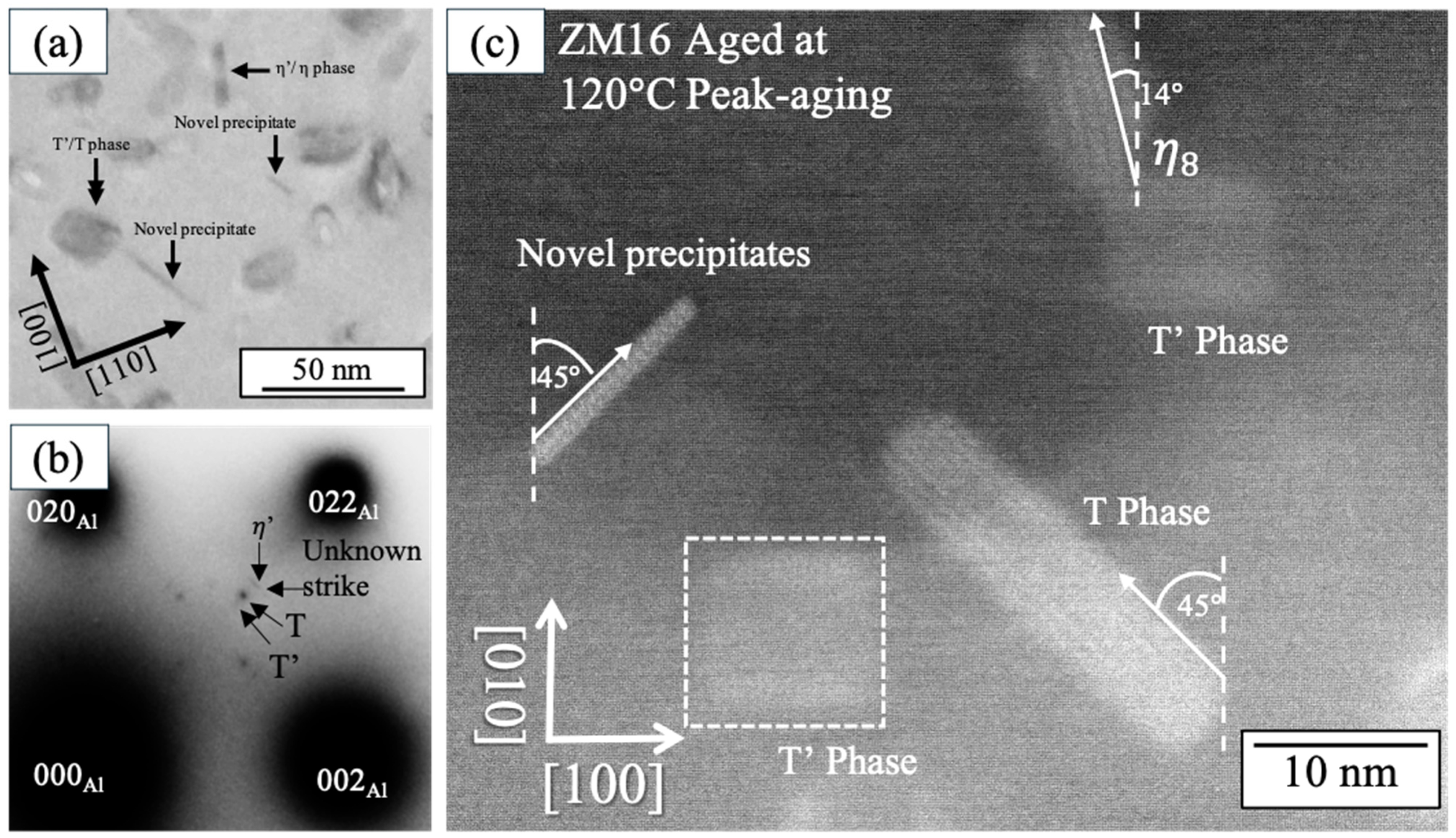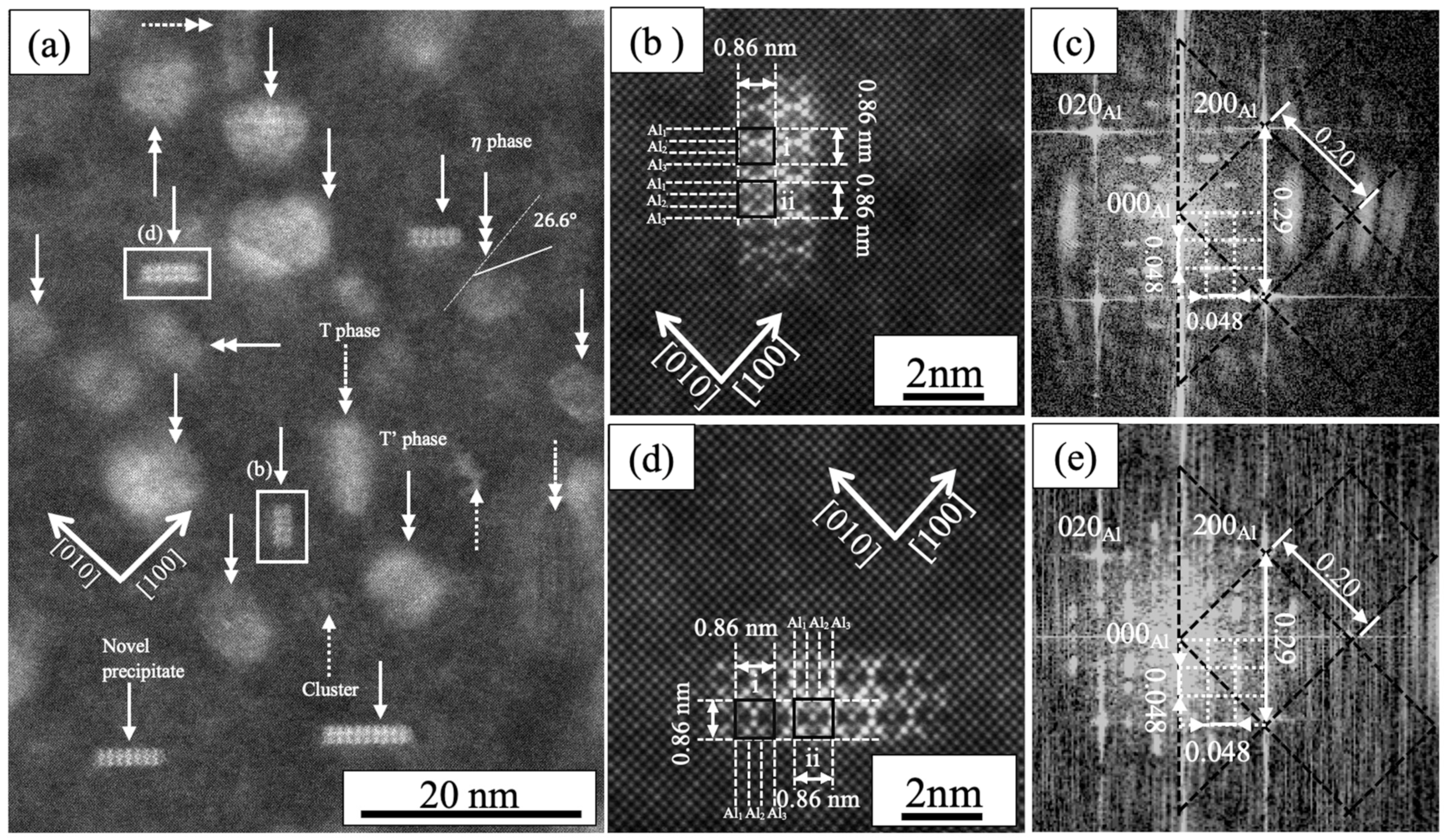 - Zou, Y.; Wu, X.; Tang, S.; Zhu, Q.; Song, H.; Cao, L. Co-precipitation of T′ and η′ phase in Al–Zn–Mg–Cu alloys. Mater. Charact. 2020, 169, 110610. [Google Scholar] [CrossRef]