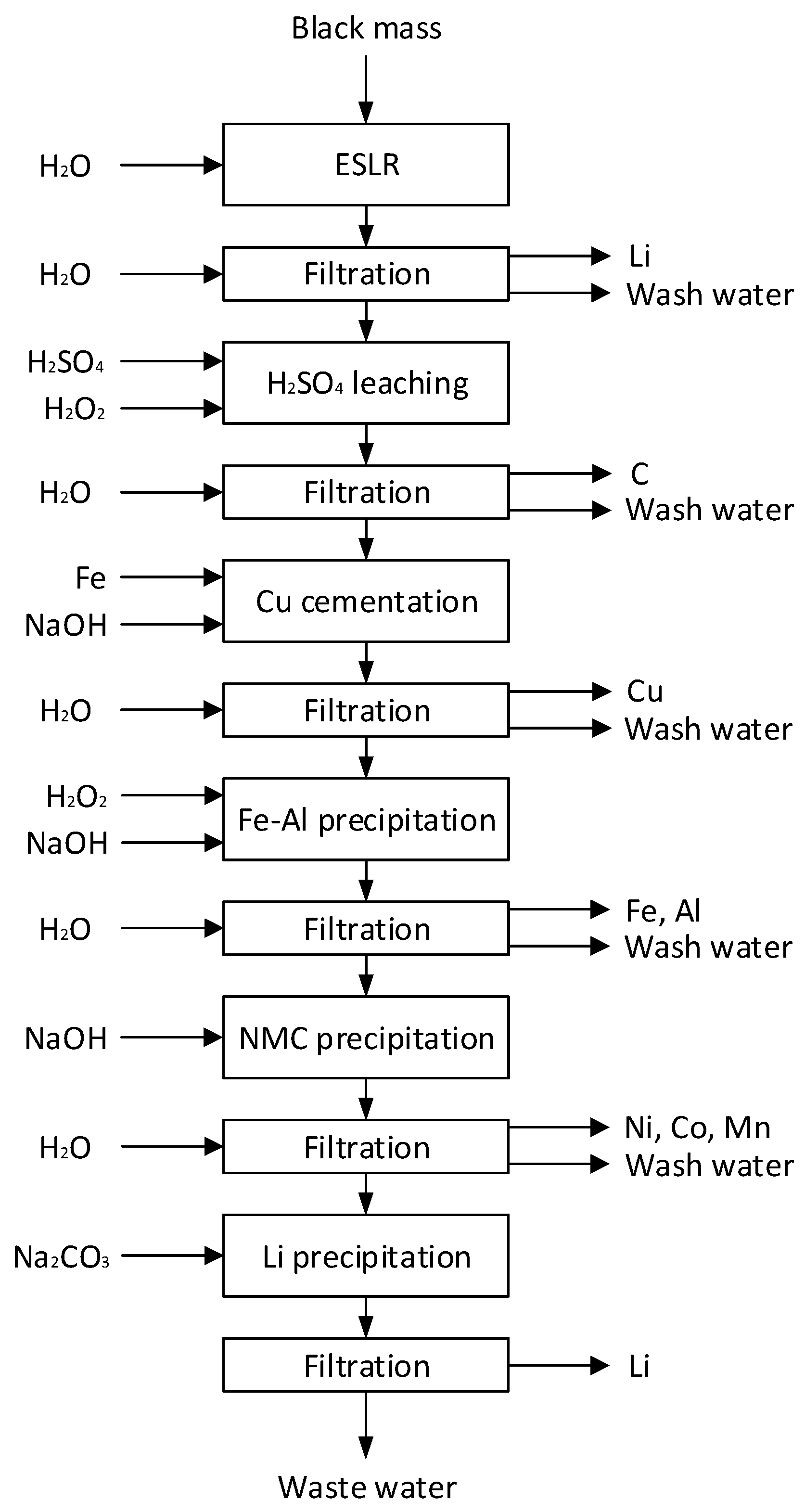 The analyzed reference process included six process steps, each followed by a filtration and one wash step (see Figure 1). In the first step, which was ESLR, 67.5 g of black mass was leached in 1350 mL H2O at room temperature (RT, 20 °C) for 120 min. Moving on to the filter cake of the subsequent filtration, the Li-poor black mass was leached with 750 mL of 2 M H2SO4 (96%, PanReac AppliChem GmbH, Darmstadt, Germany) at 80 °C for 120 min. Additionally, 37.5 mL of 50 g/L H2O2 (35%, Bernd Kraft GmbH, Den Haag, Netherlands) was added to the leaching process. The filtrate of the next filtration was used for Cu cementation. Therefore, 300 g/L NaOH (pellets, PanReac AppliChem GmbH, Darmstadt, Germany) was pipetted until a pH of 1.15 was reached. Then 5.65 g of Fe powder (99.5%, Merck KGaA, Darmstadt, Germany) was added to precipitate Cu over a reaction time of 30 min at 60 °C by cementation. The resulting filtrate was used in the fourth process step, named Fe-Al precipitation, where the pH was adjusted to 4.2 with a further 300 g/L of NaOH. After adding an additional 10 mL of 50 g/L H2O2, the reaction took place at 60 °C for 30 min. The received filtrate was used for NMC precipitation, where further 300 g/L NaOH was pipetted to reach a pH value of 10.4 at RT. The filtrate was used for Li2CO3 precipitation, which represented the last step of the process. Therefore, the solution was boiled down to 200 mL and 100 mL of 150 g/L Na2CO3 (≥99.5%, Sigma-Aldrich Chemie GmbH, Taufkirchen, Germany) was added using a burette. The reaction took place at 95 °C for a duration of 10 min. ESLR, NMC precipitation, and Li2CO3 precipitation were performed in a beaker on a laboratory stirrer (SLR, Xylem Analytics GmbH, Weilheim, Germany) with an agitator at 200 rpm. Since Li2CO3 precipitation was only partially effective due to excessive residual Li concentrations in the filtrate, it was calculated using the value of NMC filtration as if boiling down the solution. H2SO4 leaching, Cu cementation, and Fe-Al precipitation was carried out in a 1 L double-walled reactor that was heated with a thermostat (Eco Silver, LAUDA DR. R. WOBSER GMBH & CO. KG, Lauda-Königshofen, Germany). The fluids were homogenized using a mechanical stirrer (EUROSTAR 20 digital, IKA-Werke GmbH & Co. KG, Staufen, Germany). Temperature and pH value were set and recorded using an electrode (pH Sensor InPro4260i/SG, Mettler-Toledo GmbH, Gießen, Germany) in combination with a digital setup (developed and built at IME, RWTH Aachen, Germany).