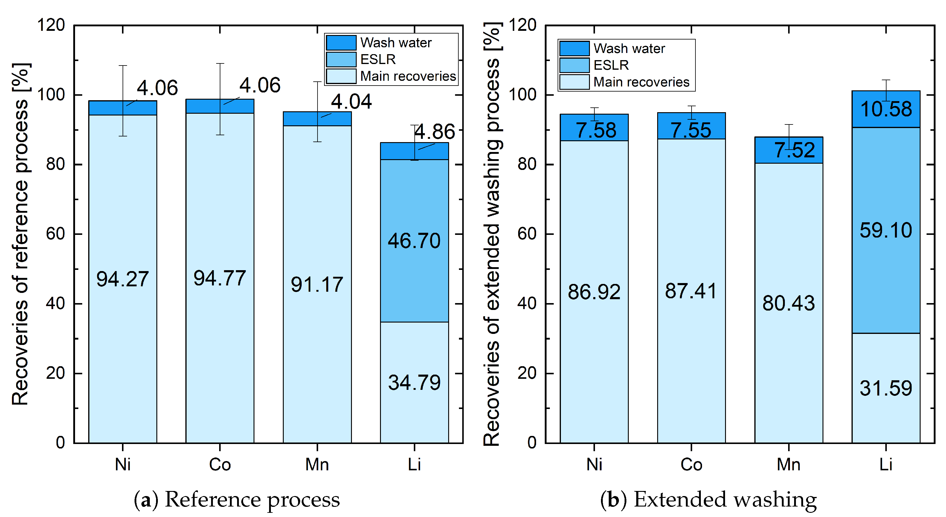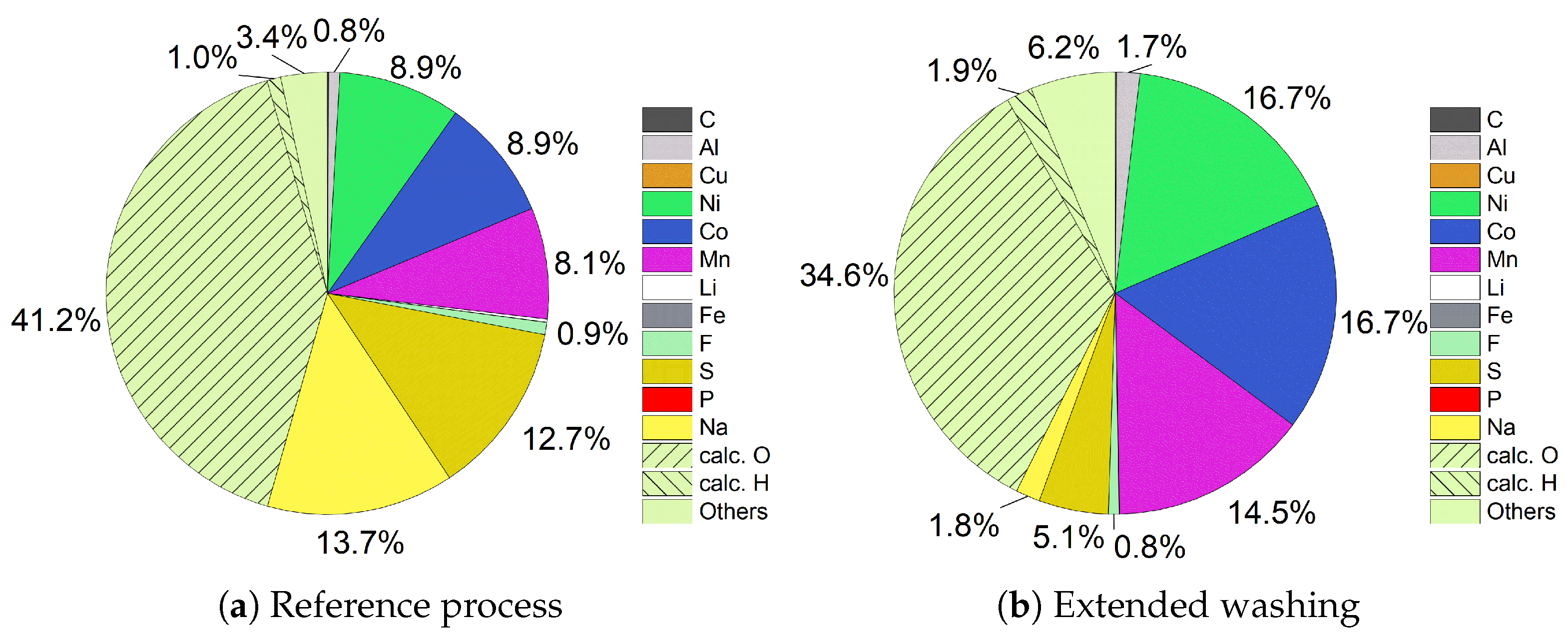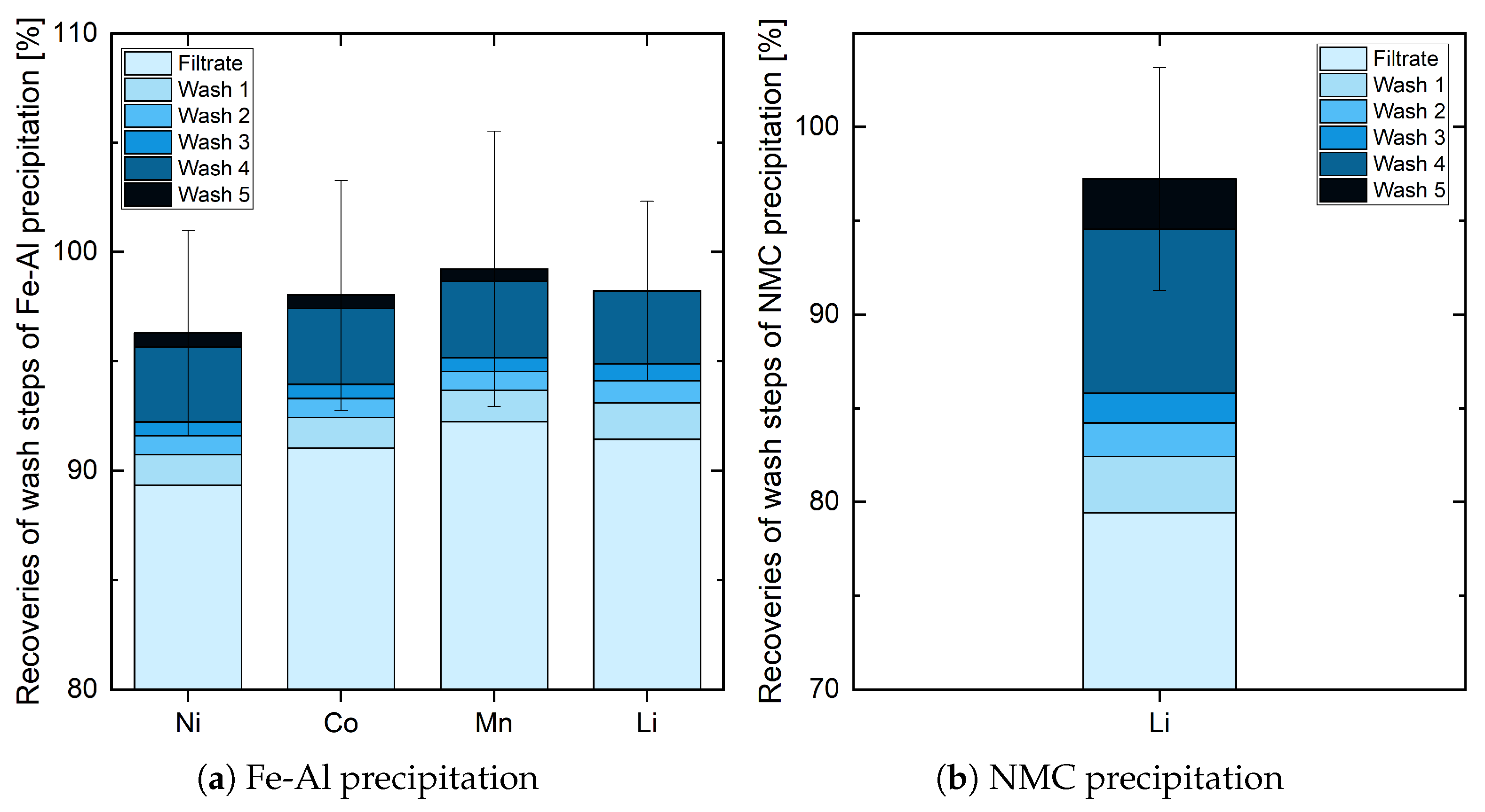 Regarding purity, the compositions of the filter cakes were analyzed. In the case of ESLR, with an increase of Li from 18.1% in the reference process to 20.4% after extended washing, only a small improvement was achieved. The comparison of the filter cakes after H2SO4 leaching showed that more than one wash step resulted in no further improvement; thus, the filter cake retained the same quality. Fe-Al precipitation, on the other hand, showed an improvement from 18.9% Fe after the reference process to 40.5% after extended washing, which is a significant result. Additionally, impurities in the form of Na and S were removed and Ni, Co, and Mn were recovered by wash water, which also justifies five washing steps. Extended washing after NMC precipitation also achieved a great improvement. While filter cakes showed only less than 26% of NMC after the reference process, this accounted for nearly 48% when removing impurities by extended washing, which is why five wash steps are recommended here as well.