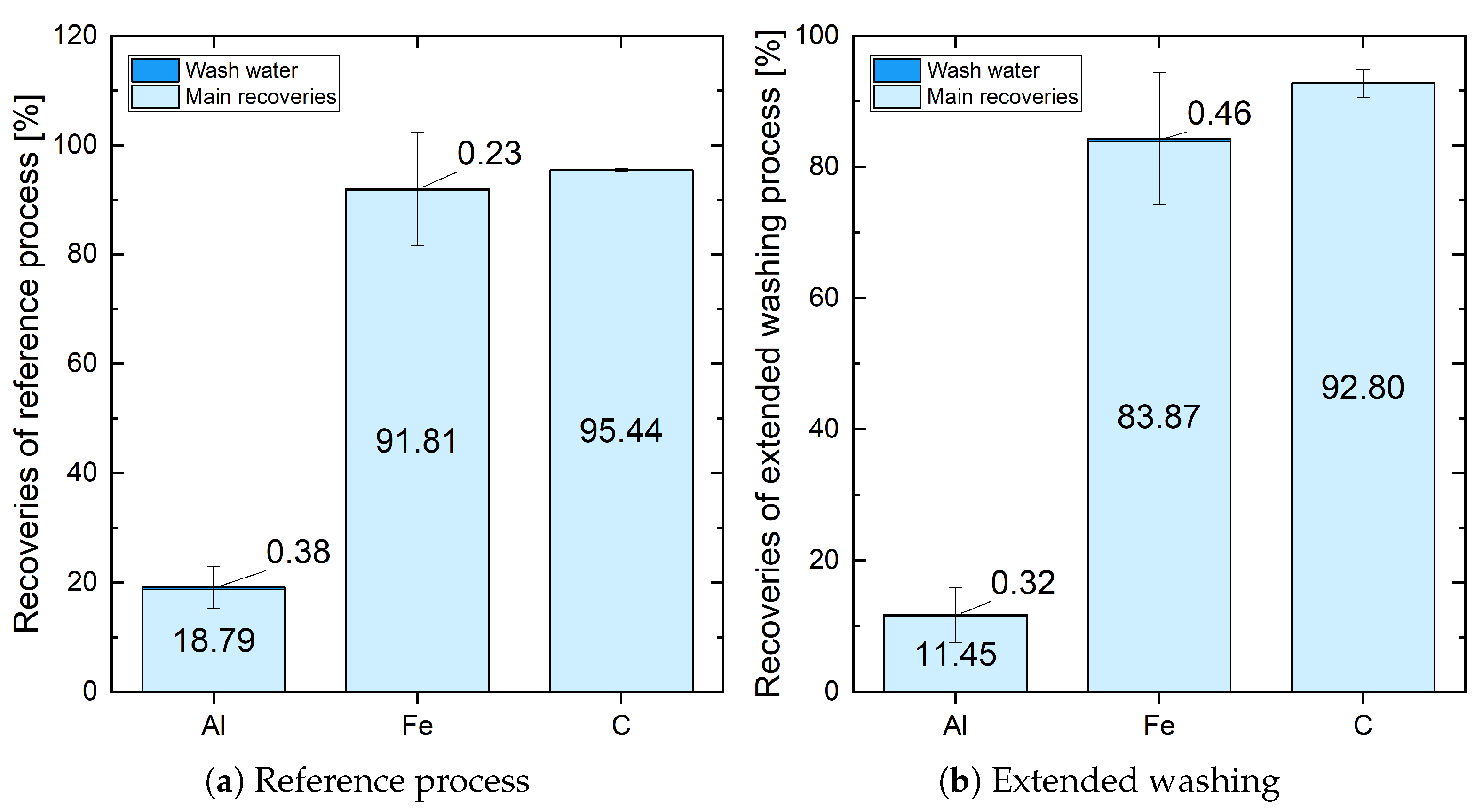 Figure 3 shows the comparison between the recoveries of Al, Fe, and C in the reference process and extended washing. It is apparent that the recovery of Al is very low in both cases (18.79% and 11.45%). This can be attributed to the insoluble phases in black mass, which were left in the system after H2SO4 leaching, and LiAlO2, which was removed by ESLR. Since only Al in Fe-Al precipitation is relevant for Al recovery, those two were not taken into account. The recovery of Al by wash water is negligible in both cases (less than 0.4%). Fe shows the same behavior as Ni, Co, and Mn. While the main recovery of the reference process was 91.81%, extended washing reduced it to 83.87% due to losses in the additional process steps. The wash steps were unsuccessful in terms of recovery (<0.5%). C had already demonstrated a good recovery in the reference process (95.44%), which slightly decreased due to losses in extended washing (92.80%). The recoveries by wash water could not be determined because the methods of analysis were not able to detect C in liquid solutions. Cu was not evaluated because previous analyses have shown that it precipitated almost completely during Cu cementation. However, the Cu cementation filter cake did not provide enough mass for analysis. In all other filter cakes, the Cu concentration was below the detection limit.