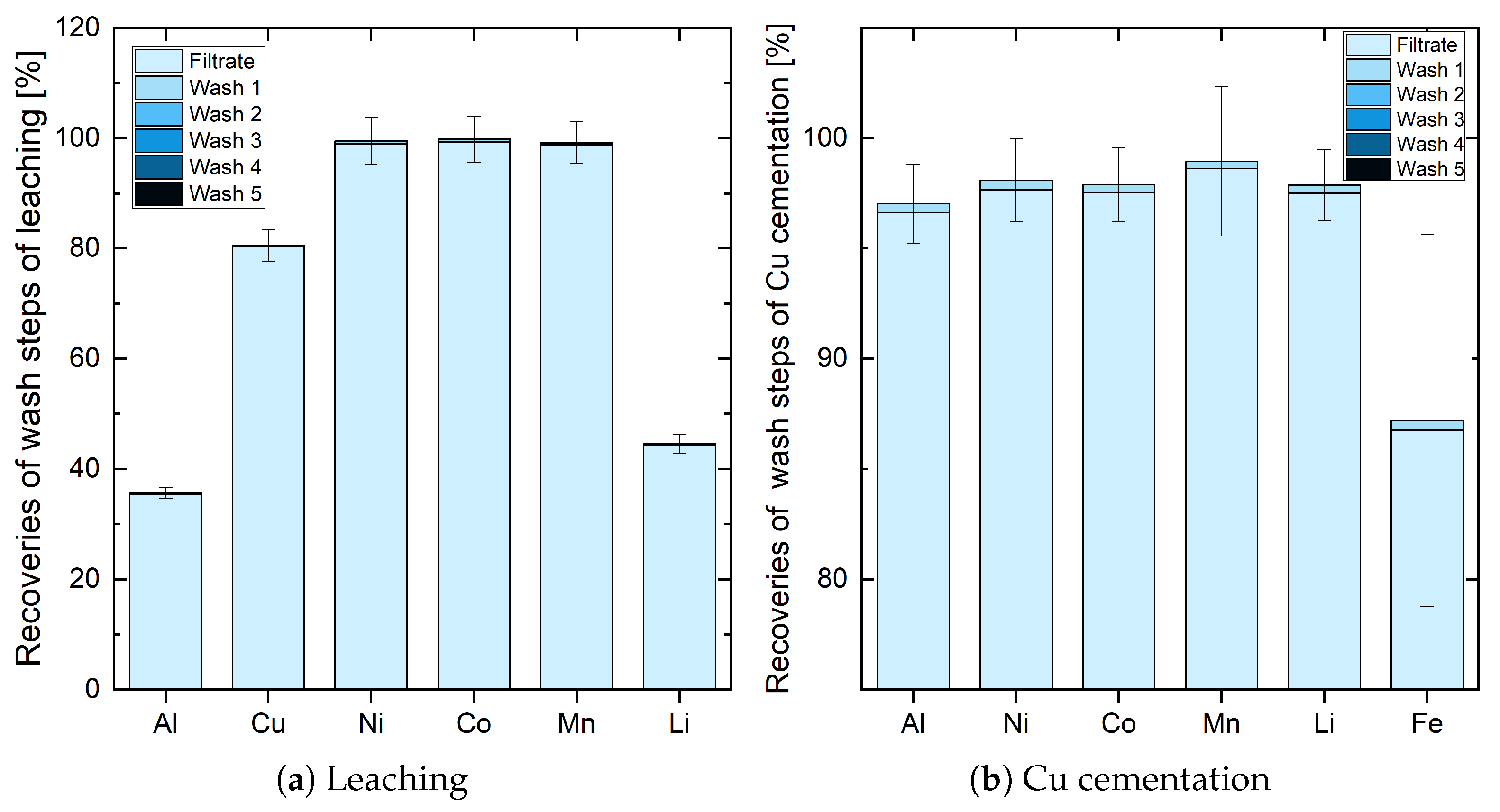 In the case of the hypothetical recirculation of the wash water into the process, the mass fraction of an element in the wash water must not be entirely attributed to the recovery. Since losses would still occur in the corresponding filter cake during recycling in subsequent process steps, these must be taken into account and deducted in the calculation. In the example of leaching, the mass of an element in wash water m e w w l e a c h i n g must be adjusted with the losses in Cu cementation, Fe-Al precipitation, and NMC precipitation taken into account by the mass fractions of an element in the respective filter cake x e f c to receive the realistic recirculated mass m e w w l e a c h i n g (see Equation (3)). The same applies to Equation (4) for Cu cementation and Equation (5) for Fe-Al precipitation. In case of NMC precipitation, there is no further adjustment necessary (see Equation (6)).