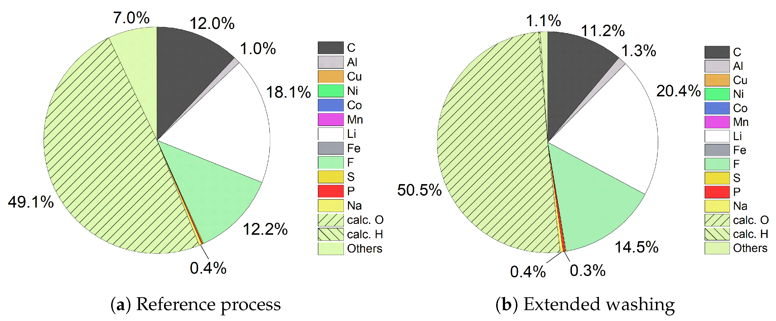 Figure 7 compares the compositions of ESLR filter cakes. While the reference process in (a) shows 12.0% C, 1.0% Al, 18.1% Li, and 12.2% F, extended washing resulted in an increase of Li (20.4%), F (14.5%), and Al (1.3%), while C was reduced (11.2%) (see (b)). The unknown part was reduced from 56.1% to 51.8%. With the assumption that C was completely present as Li2CO3, Al as LiAlO2, and the remaining Li as LiOH, the amount of O can be calculated to be 49.1% in the reference process and 50.5% after extended washing. If F was available as LiF, more than 90% of filter cakes consisted of Li compounds in both cases. Due to the compositions of the filter cakes and the previous assumptions of chemical compounds, it can be concluded that the increased amount of wash water mainly dissolve additional LiF and LiAlO2. It can be inferred that washing the filter cakes has only a small impact on the purity. Even if the quantity of Li increases (see Section 3.1 and Section 3.2), the quality remains similar. This can be explained by the fact that at this point in the process no impurities by H2SO4 or NaOH entered the system.