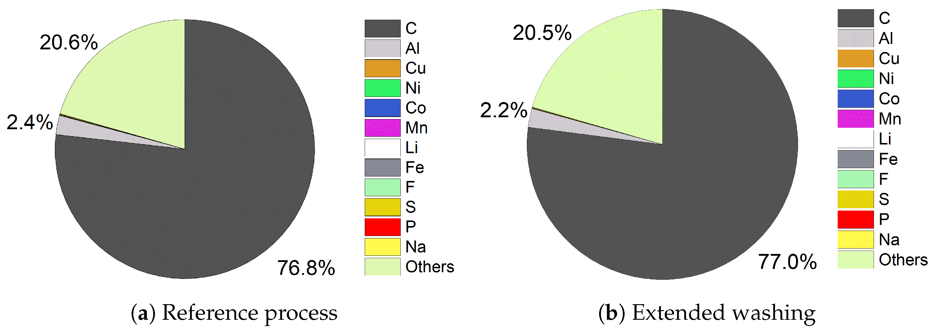 In case of leaching, the compositions of the filter cakes from the reference process and extended washing are nearly identical. The values of C (76.8%, 77.0%), Al (2.4%, 2.2%), and unknown components (20.6%, 20.5%) are very close to each other (see Figure 8). Due to the low retention capacity of the Li-poor black mass, one wash step is enough to clean the filter cake and achieve the results close to extended washing. The unknown part of the filter cakes can be attributed to O and H of hydrocarbons, which are partially still available because pyrolysis took place at a temperature of 650 °C.