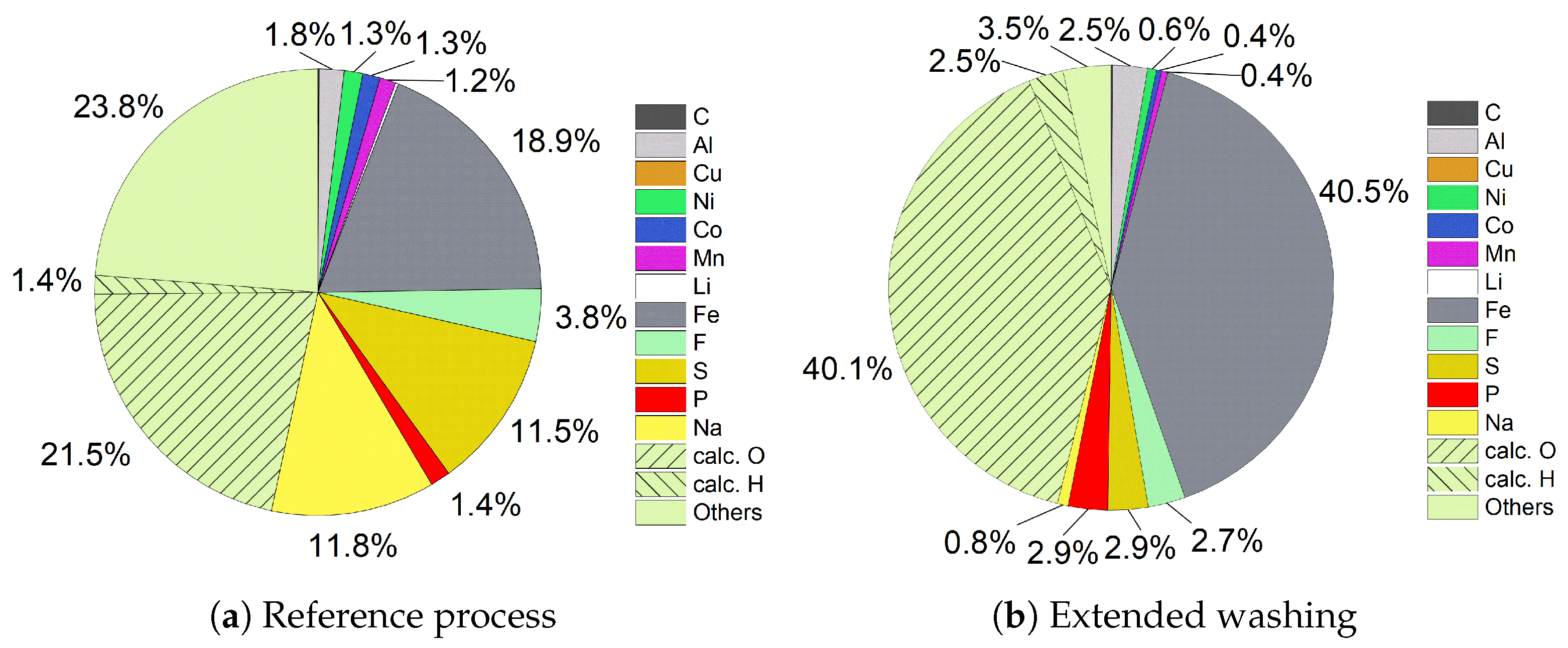 The filter cake from the Fe-Al precipitation in the reference process (Figure 9a) shows only one-fifth of the target elements Fe (18.9%) and Al (1.8%). With the assumption that both were available as hydroxides, it would account for up to two-fifths in total. While cathode materials like Ni (1.3%), Co (1.3%), and Mn (1.2%) were still left in small amounts after one wash step, the highest impurities came from Na (11.8%) with the use of NaOH and S (11.5%) and with the use of H2SO4. This can be explained by the sponge-like structure of the voluminous filter cake, which contains, even after the first wash step, many of dissolved ions. Provided that Na and S were present as Na2SO4 and Ni, Co, and Mn as hydroxide compounds, 21.5% of 46.6% of the unknown components can be attributed to O and 1.4% to H by calculation. The influence of extended washing can be seen in Figure 9b. The first thing to notice is the highly increased amount of Fe, with 40.5% of it having more than doubled. Al also increased from 1.8% to 2.5%, which results in a total amount of 84.8% target compositions if they are available as hydroxides. The amount of impurities dropped significantly by extended washing, resulting in low values for Ni (0.6%), Co (0.4%), and Mn (0.4%), as well as for S (2.9%), and especially Na, which was reduced to 0.8%. With the same assumptions regarding compounds like before, the amount of O can be calculated to be 40.1% and the amount of H to be 2.5%. It can be concluded that the dissolved ions, which were contained in the filter cake, were washed out by extended washing, leading to both an increased quantity and a sharply increased quality in the filter cake.