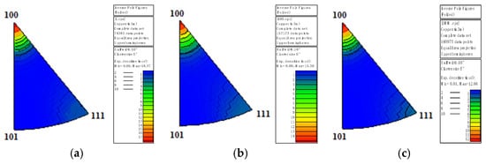 Figure 1 shows that pure copper wires with different degrees of deformation all exhibit a strong <100> texture. The <100> texture is strongest in the pure copper wire with 91% deformation, weakest in the wire with 87% deformation, and the <111> texture also appears in the latter. This is in agreement with the experimental findings of Yang et al., who reported that with increasing strain, the volume fraction of the <111> texture first increased and then decreased, whereas that of the <100> texture rose [].