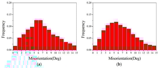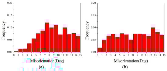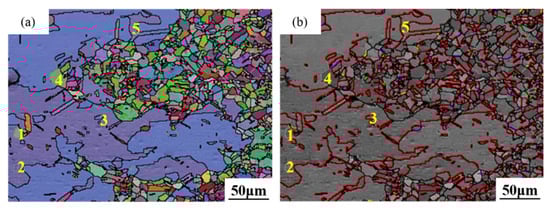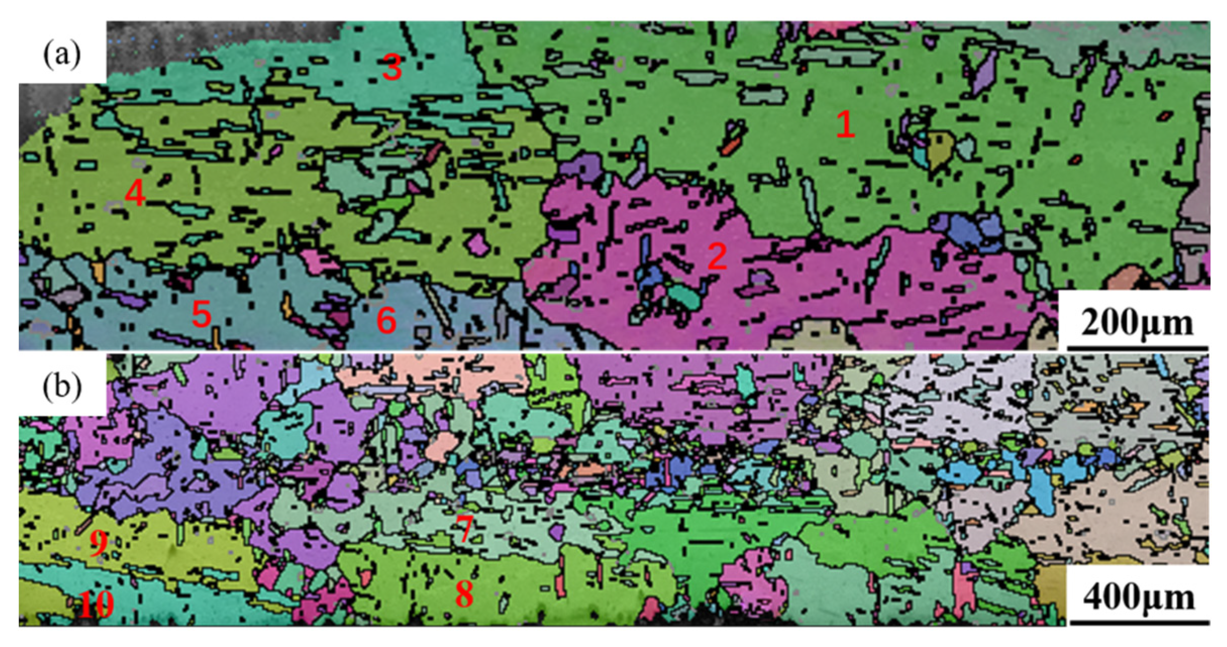 In Figure 11a, a pink secondary twin boundary is visible between columnar grains 1 and 2, while a red twin boundary can be observed between grains 3 and 4. Figure 11b also shows twin boundaries between columnar grains 6 and 7, as well as between grains 8 and 9. These special HAGBs possess relatively low energy and mobility, thereby reducing the overall system energy. Zhang et al., in their study on directional heat treatment of cold-rolled pure iron, found that grain boundaries between columnar grains tend to form low-energy boundaries, such as twin boundaries [], which is similar to the results of this experiment.