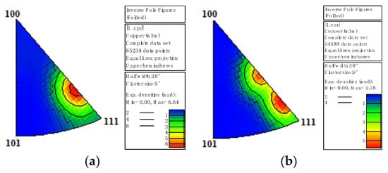 Distribution map of <111> texture in the initial microstructure of pure copper wires with different deformation amounts: (a) 89%; (b) 87%.