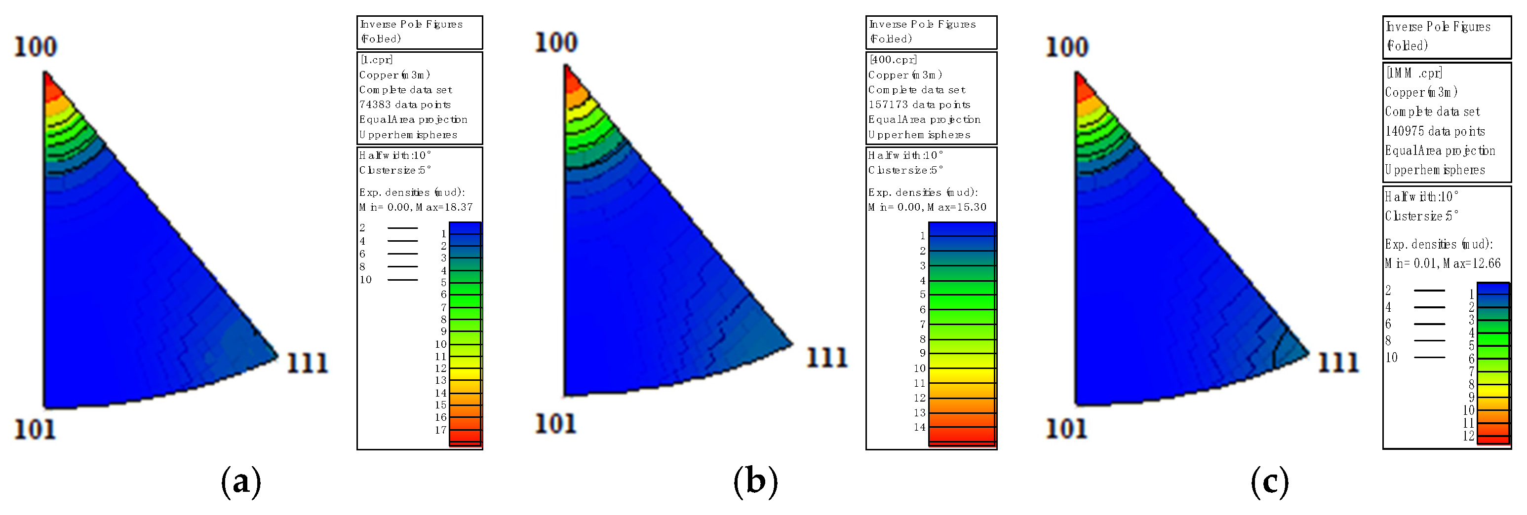 Inverse pole figures along the drawing direction for the initial microstructures of pure copper wires with different deformation degrees: (a) 91%; (b) 89%; (c) 87%.