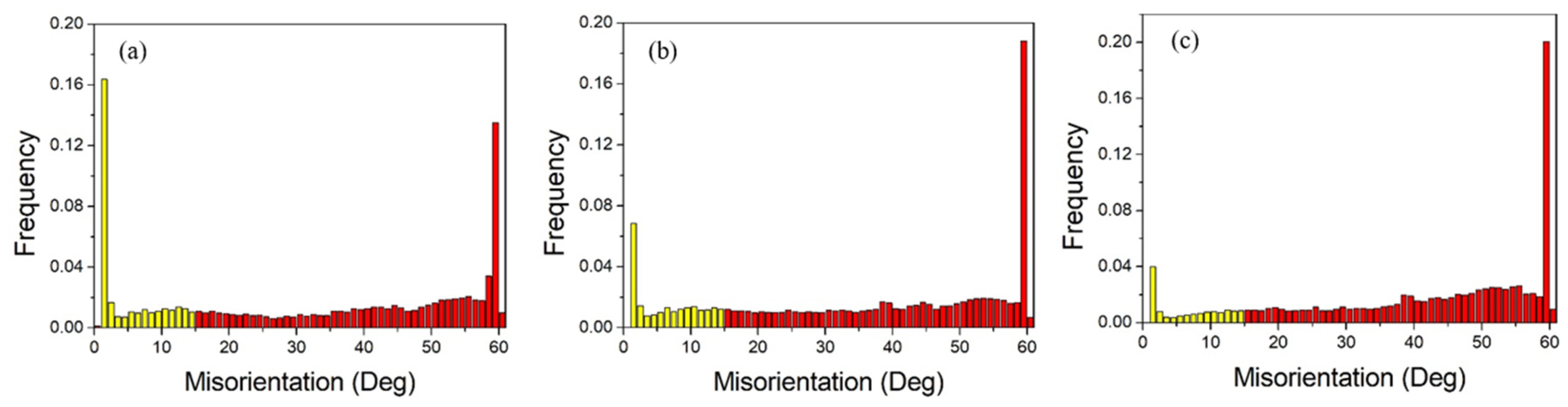 Figure 2 shows the statistical distribution of grain boundary misorientation angles in pure copper wires for three different deformation levels, where low-angle grain boundaries (LAGBs) and high-angle grain boundaries (HAGBs) are colored in yellow and red, respectively. The results indicate that HAGBs are predominant. The misorientation angle distribution is bimodal, with the first peak at approximately 2° and the second at around 60°, suggesting that 2° LAGBs and 60° HAGBs are the most prevalent types.