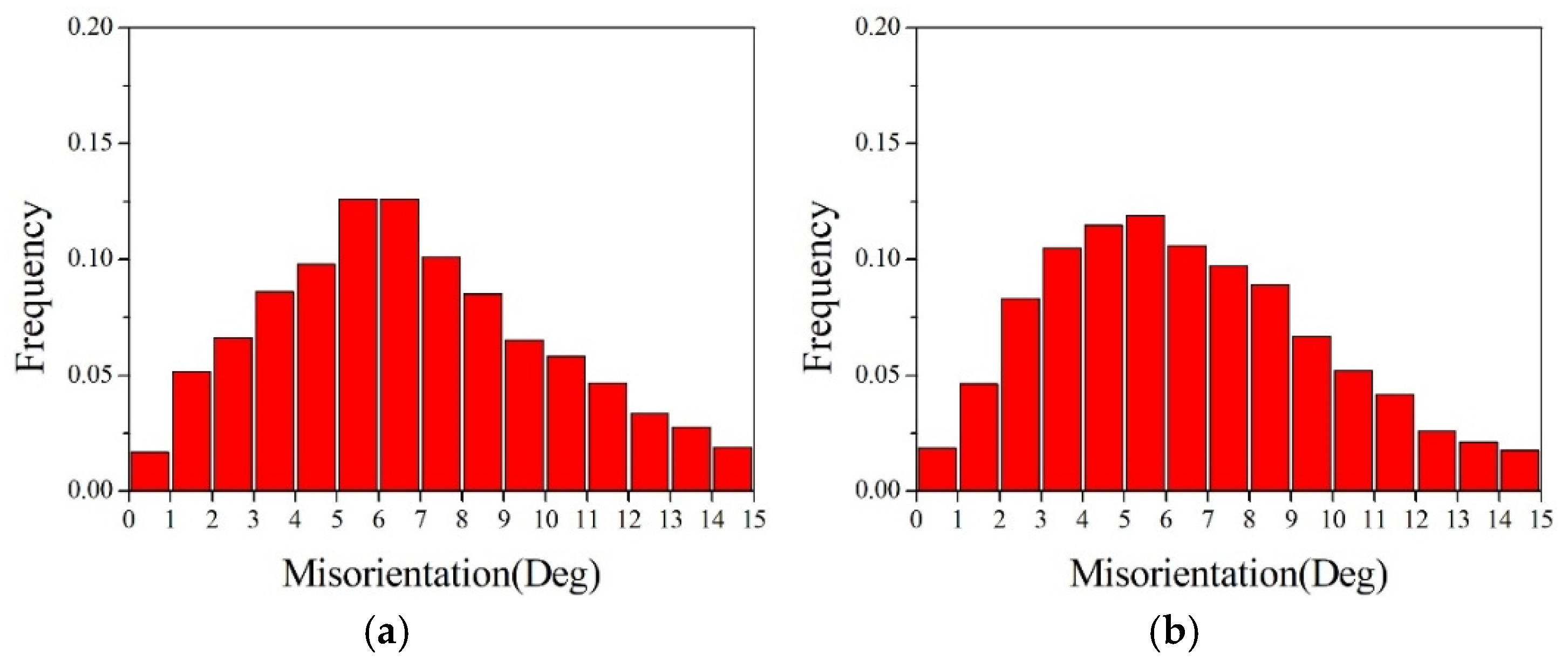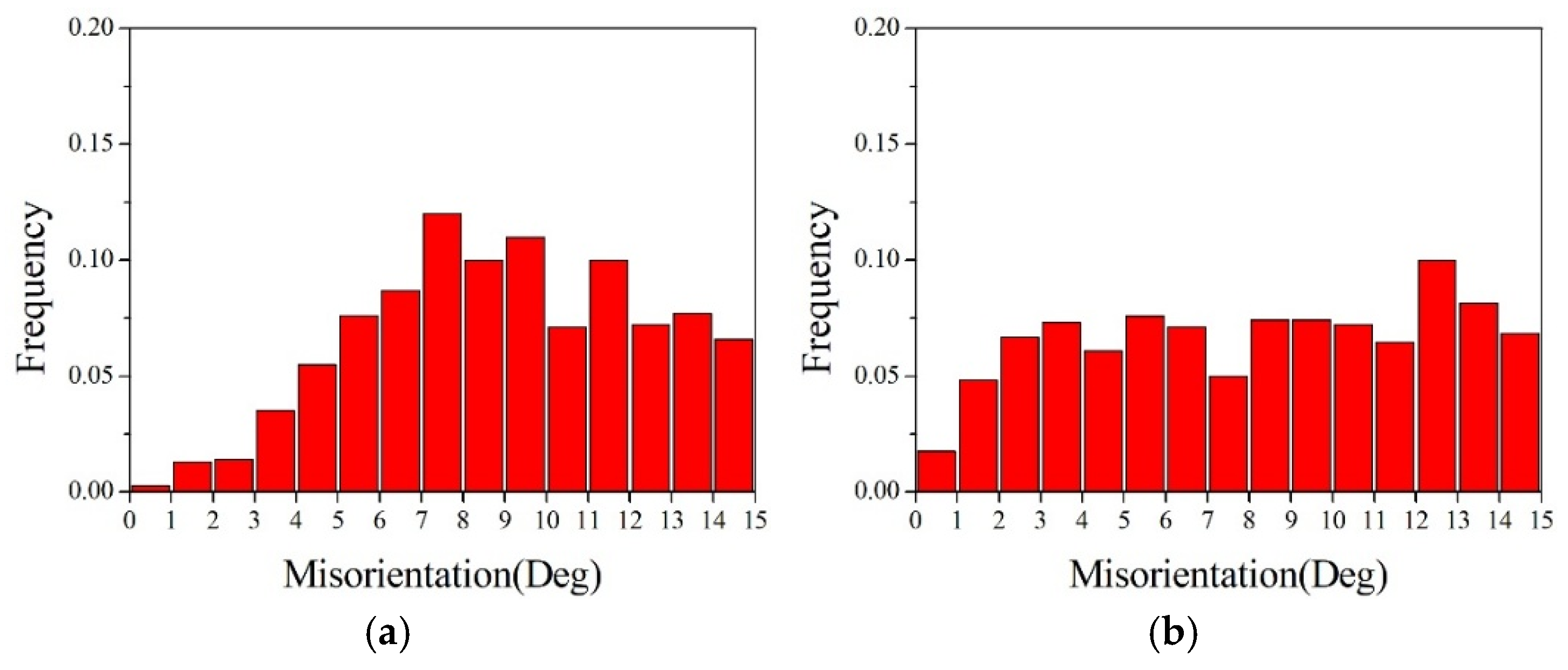 Statistical diagram of deviations from ideal <111> texture in the initial microstructure of pure copper wires with different deformation amounts: (a) 89%; (b) 87%.