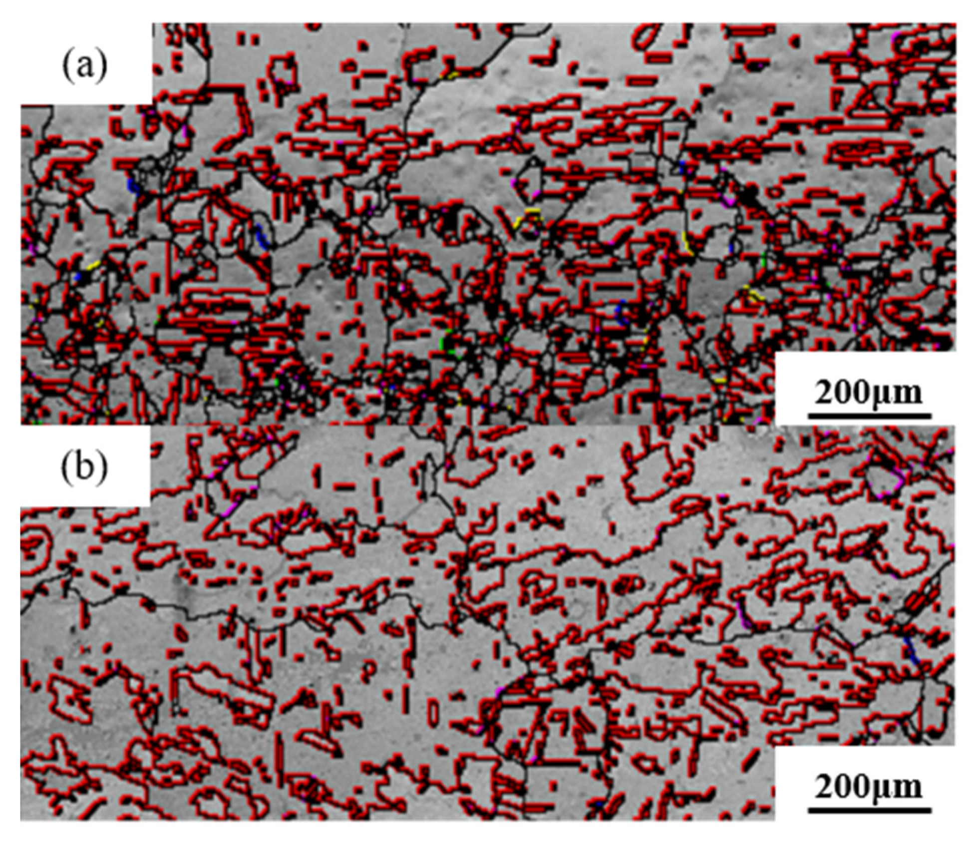 Grain boundary reconstruction maps of directional heat-treated structures under different drawing speeds at a heating temperature of 550 °C: (a) 3 μm s−1; (b) 5 μm s−1.
